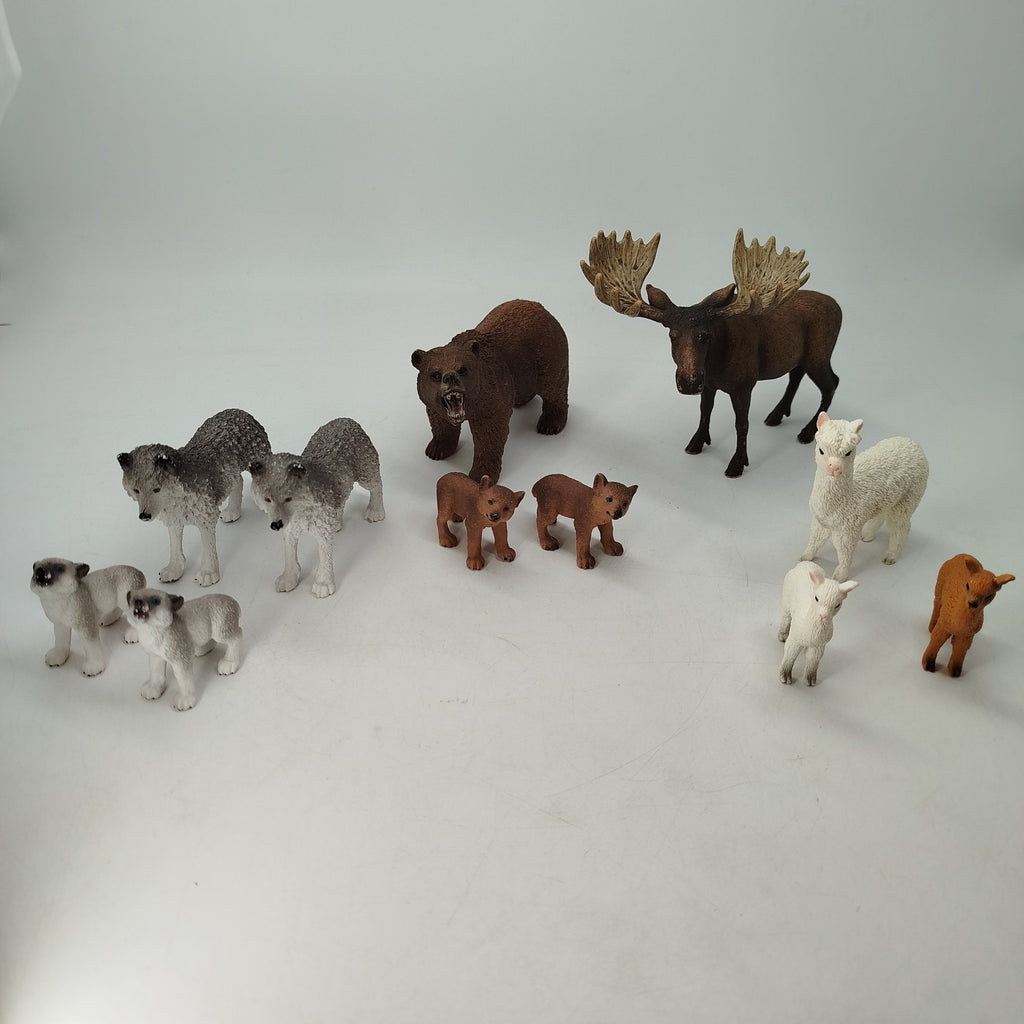 Hol dir das Schleich Tierfiguren-Set mit 11 detailreichen Modellen, darunter Wölfe, Bären, Alpakas, Elch und Rehkitz. Perfekt zum Sammeln oder für fantasievolle Rollenspiele. Einige Figuren zeigen leichte Gebrauchsspuren, Verpackung fehlt. Gib diesem nachhaltigen Spielzeug ein neues Zuhause!