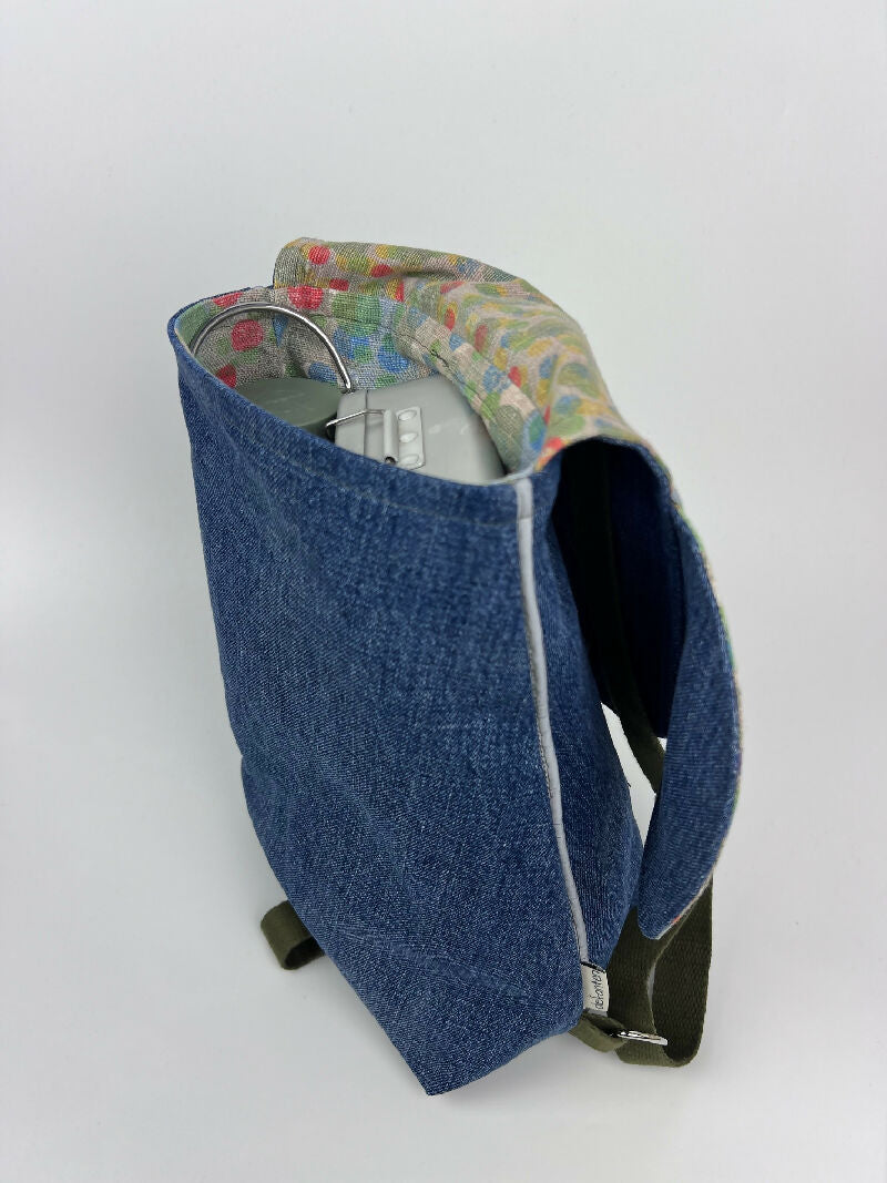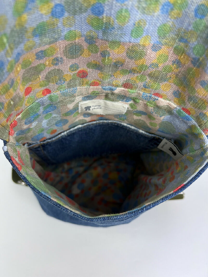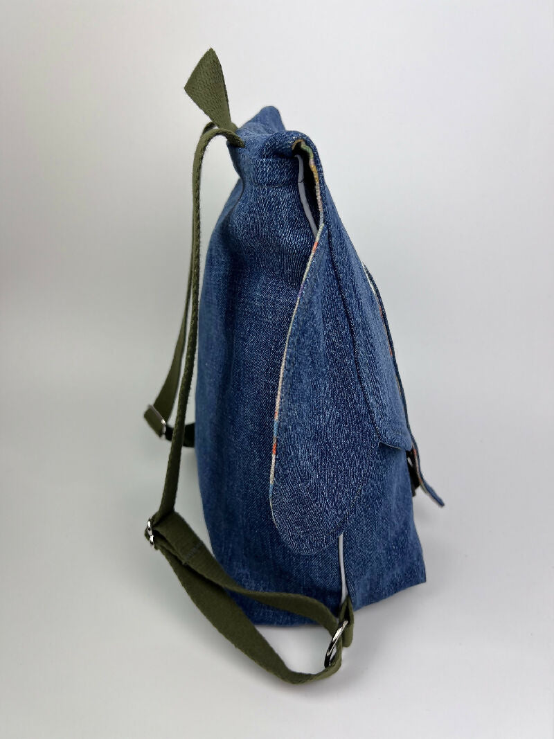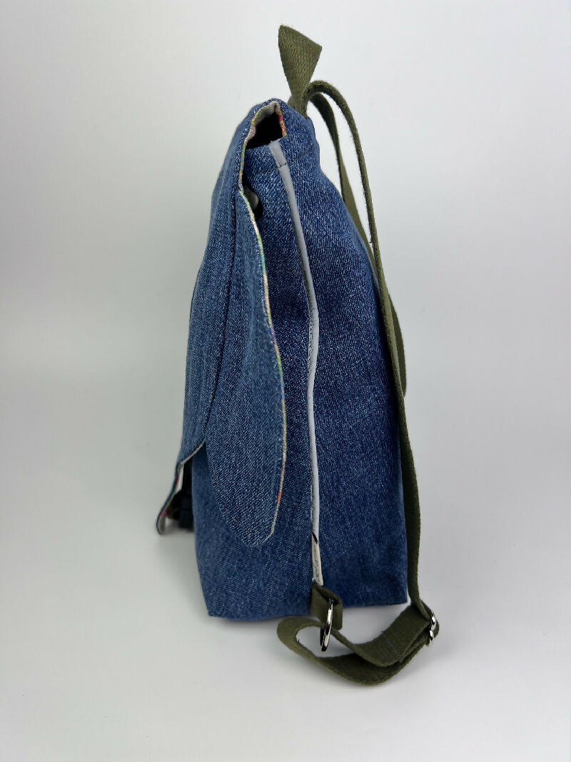 Kinderrucksack aus einer blauen Jeans mit Innentasche und verstellbaren Gurten und einem beigen Futter mit bunten Tupfen. An den Seiten wurde ein Reflex-Paspelband zur besseren Sichtbarkeit im Dunkeln eingearbeitet. Der Rucksack wird mit einer Steckschnalle verschlossen, die sich sehr einfach von Kinderhänden öffnen und schließen lässt. Olefanten Rucksäcke sind schön handlich und eignen sich perfekt für die Kita oder den Kindergarten.