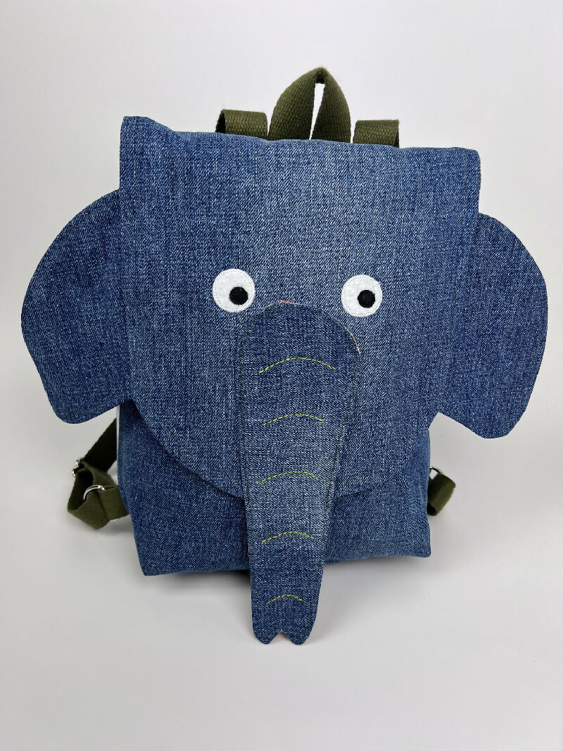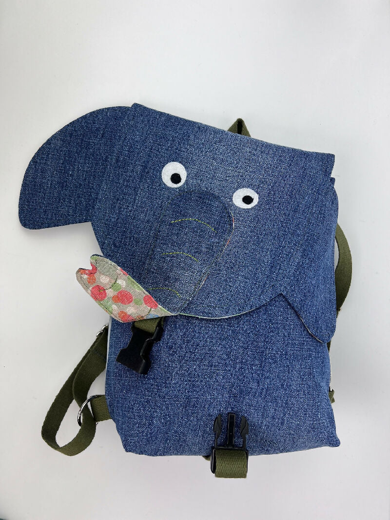 Für die Aufhänger und Tragegurte wurden Baumwollband und Metallringe/-schnallen verarbeitet. Eine Steckschnalle aus recyceltem Kunststoff verschließt den Rucksack. Die Augen bestehen aus Filz und die Rucksackklappe wurde mit einer Bügeleinlage aus Baumwolle verstärkt.