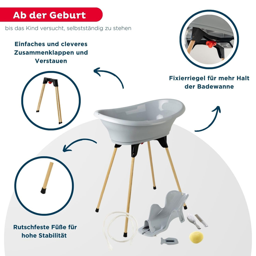 Als französischer Erfinder des ersten Babyflaschenerwärmers und mit einer langen, 70-jährigen Geschichte pflegt Thermobaby sein Fachwissen. Das Unternehmen unterstützt die französische Produktion und Qualitätssicherung, um ergonomische, interessante und praktische Produkte anzubieten. Heute werden unsere Babyprodukte in mehr als 40 Ländern weltweit verkauft. Im Einklang mit seinen Werten stellt Thermobaby Design und Innovation in den Mittelpunkt, um den Bedürfnissen von Kindern und Eltern gerecht zu werden. Seit seiner Gründung hat das Unternehmen nie aufgehört, Innovationen voranzutreiben. Das VASCO 7-in-1-Babybadeset von THERMOBABY ist ein vollständiges Set für das Babybad. Das Set umfasst eine Badewanne, einen zusammenklappbaren Ständer aus Holz, einen Abflussschlauch, eine Badeliege, ein Thermometer, eine Bürste, einen Kamm und einen Schwamm. Dank seiner patentierten Innovation lässt sich dieses Set zusammenklappen, ist stabil und kann für den Komfort Ihres Babys eine Badeliege aufnehmen. Es wird in Frankreich hergestellt und garantiert einwandfreie Qualität und optimale Sicherheit für Ihr Kind.