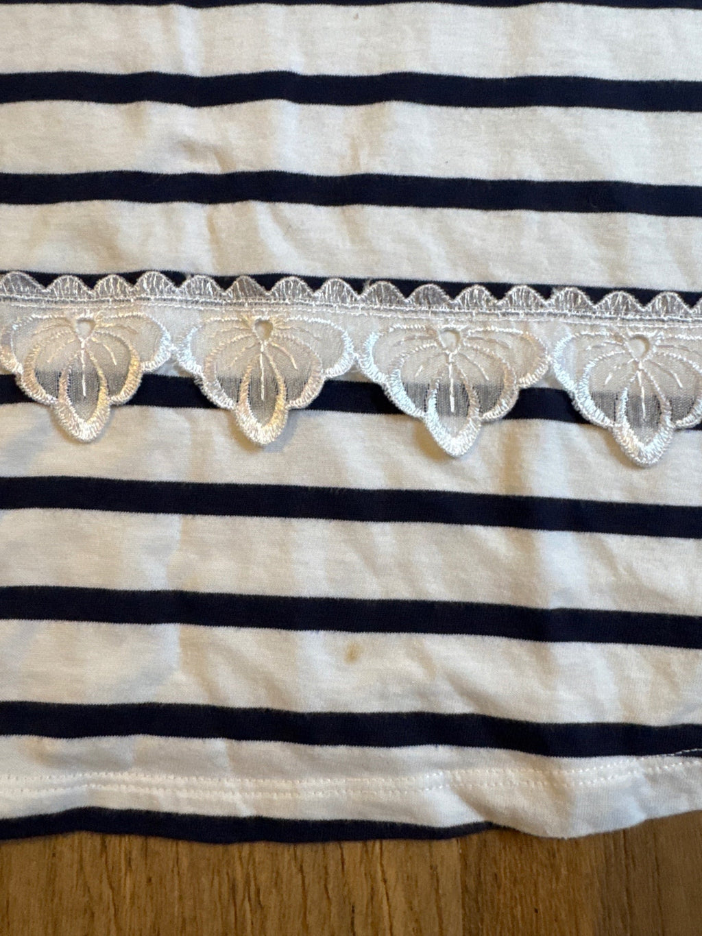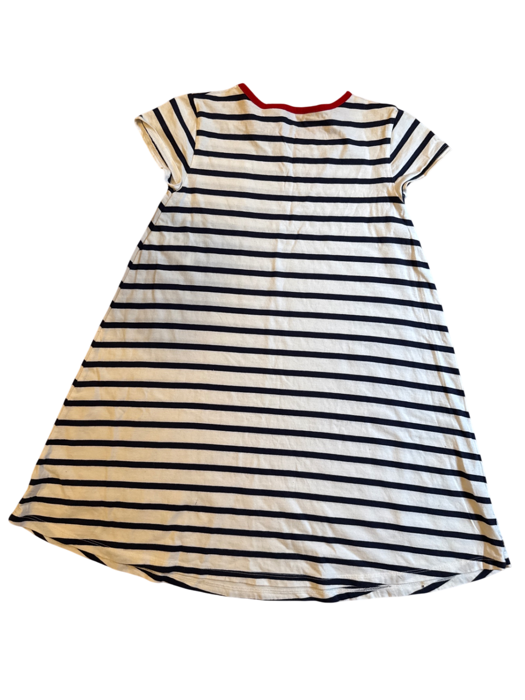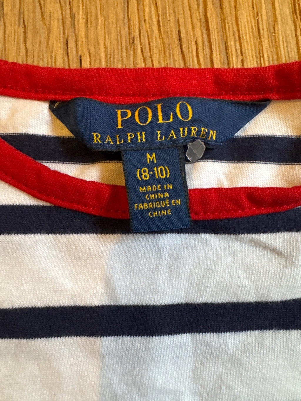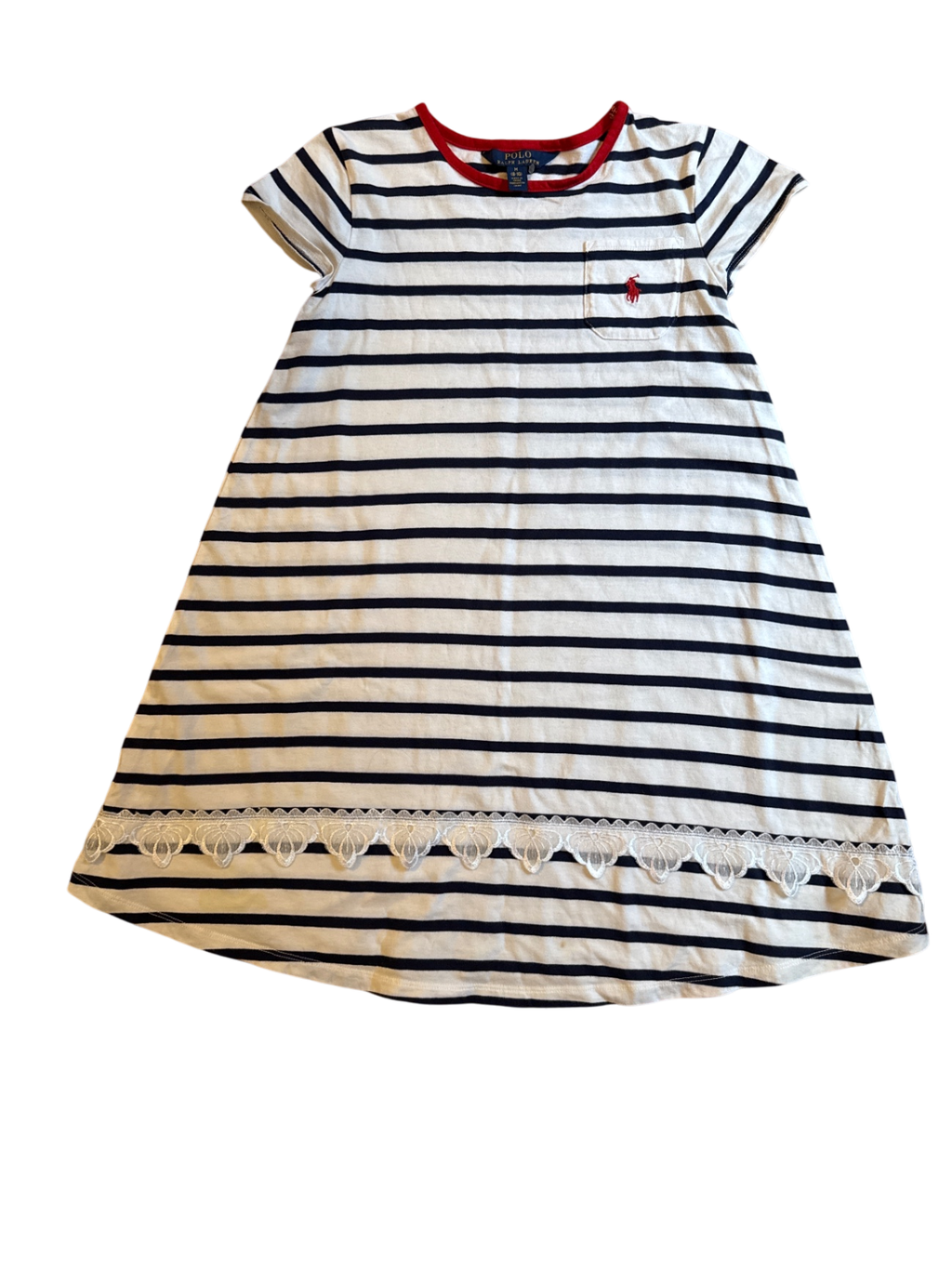 Dieses lässige und hochwertige Kinderkleid von Polo Ralph Lauren überzeugt durch klassische Streifen in Weiß und Marineblau, ergänzt durch elegante Details am Saum. Perfekt für sportliche oder entspannte Casual-Outfits. Das weiche Baumwollmaterial sorgt für angenehmen Tragekomfort. Ideal für modebewusste kleine Damen, die Wert auf hochwertig Secondhand legen. ZUSTAND - sehr gut, keine Mängel