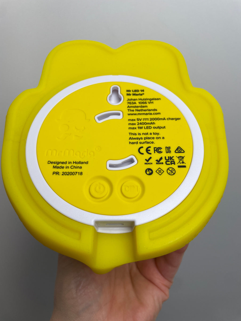 1 Ein gelbes Ladekabel ist im Lieferumfang enthalten; die erste vollständige Aufladung dauert maximal 6 Stunden. Als zusätliche Sicherheitsmaßnahme funktioniert die Nachtlampe während des Ladevorgangs nicht.