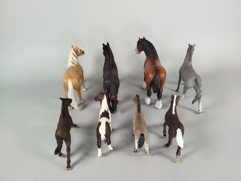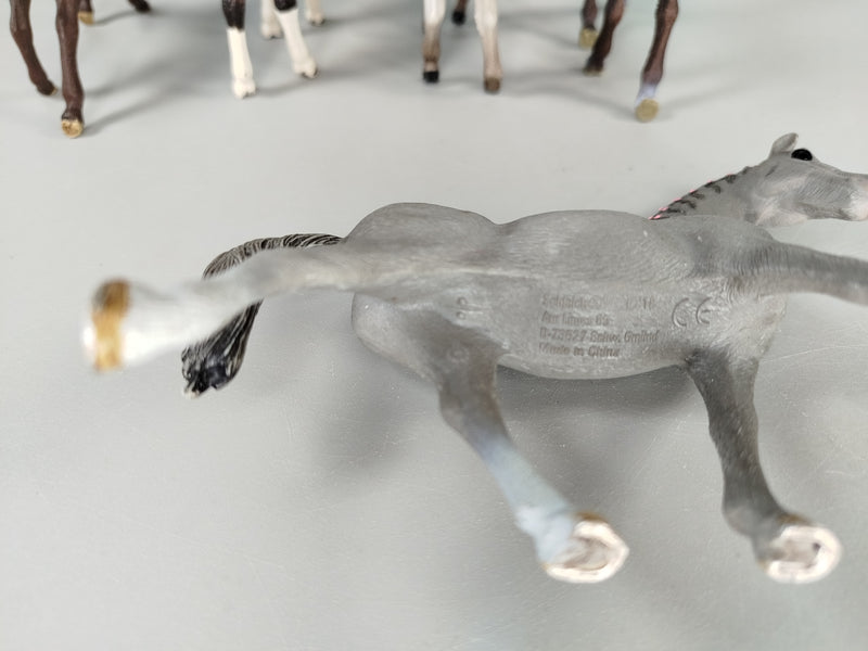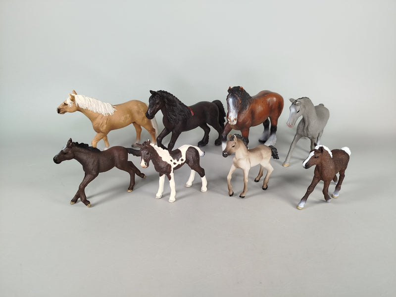 Dieses Set von Schleich umfasst 8 detailreiche Pferde, darunter 4 Fohlen. Die Pferde sind ca. 12 cm hoch und die 4 Fohlen sind zwischen 8 und 10 cm hoch. Gib diesen Figuren ein neues Zuhause und unterstütze die Wiederverwendung von Spielzeug. Hinweis: Mit den Figuren wurde gerne gespielt - sie haben sichtbare Gebrauchsspuren wie kleine Kratzer, sind aber intakt.