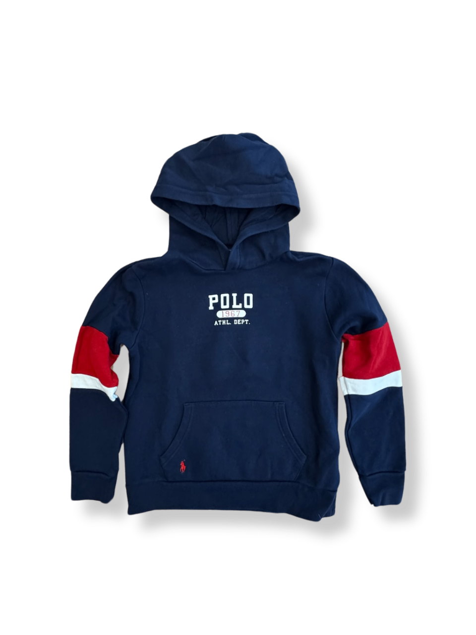 Ein sportiver Pullover von Polo Ralph Lauren in klassischem Dunkelblau. Die farblich abgesetzten Ärmel in Rot und Weiß setzen lässige Akzente. Das designorientierte Logo auf der Brust unterstreicht die hochwertige Qualität. Ideal für Freizeit und lässige Casual-Outfits.