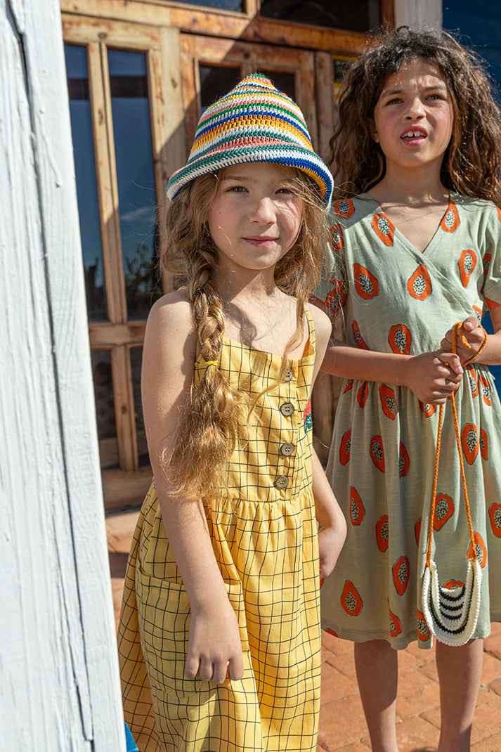 Vestido de tirantes de algodón for niñas with estampado CORBEILLE and bolsos de plastón. Corbeille significa cesta en francés. If you visit the Souk in Tangier, you will find some of the most precious items in many colors and handcrafted by artists.