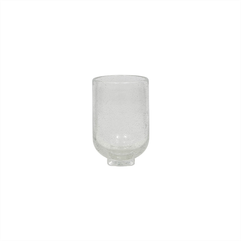 The Kuki Hurricane in glass features bubble splashes that add a touch of whimsy to its minimalist design. Its sturdy base adds a playful element to its timeless aesthetic, blending functionality with elegance. Perfect for holding candles or as a decorative piece. Being mouthblown, each hurricane will vary in size, adding to its unique charm.