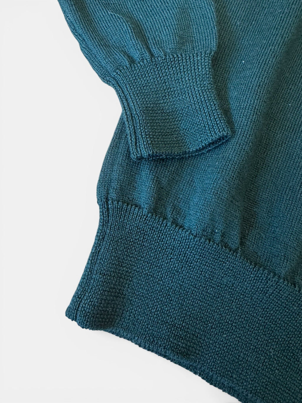 Ein dunkelgrüner Pullover mit Rundhalsausschnitt aus 100% Wolle und in gutem Zustand. Das Design ist schlicht und klassisch, geeignet für die kalte Jahreszeit.