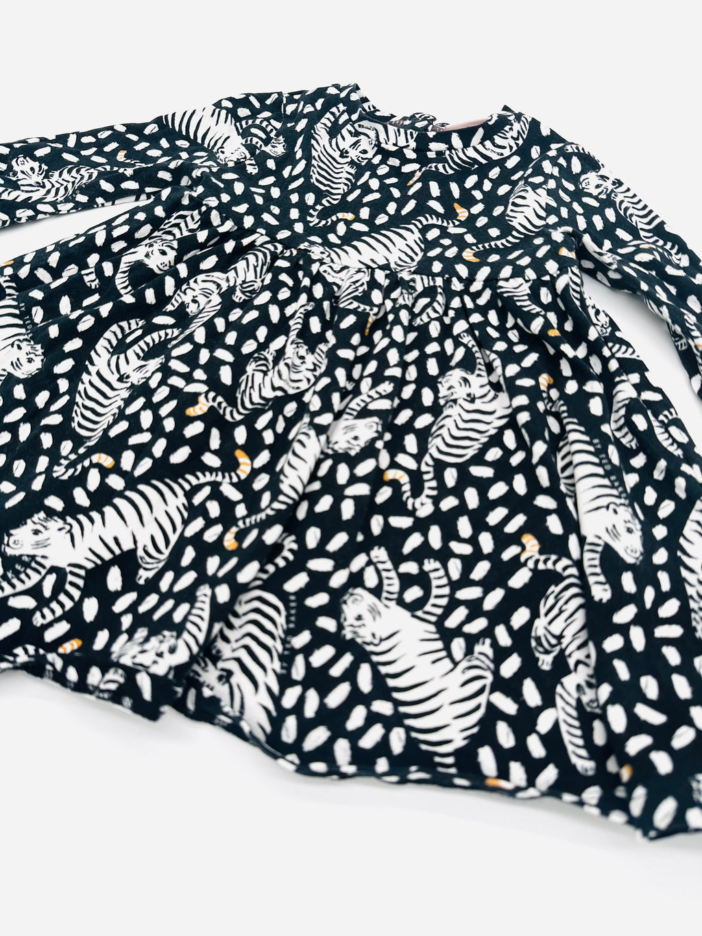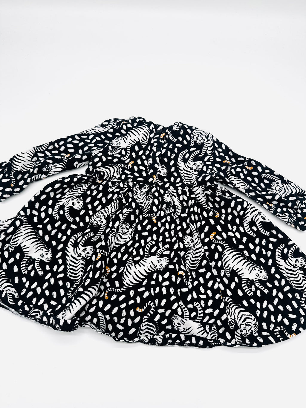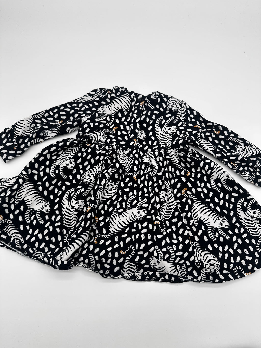 Wunderschönes Baby-Kleid von Ted Baker in Größe 74. Das Kleid besticht durch sein hochwertiges Design mit verspieltem Tiger-Allover-Print in Schwarz-Weiß und kleinen Akzenten. Der leicht ausgestellte Schnitt sorgt für einen tollen Fall und hohen Tragekomfort – ideal für besondere Anlässe oder als stilvolles Alltagsoutfit.