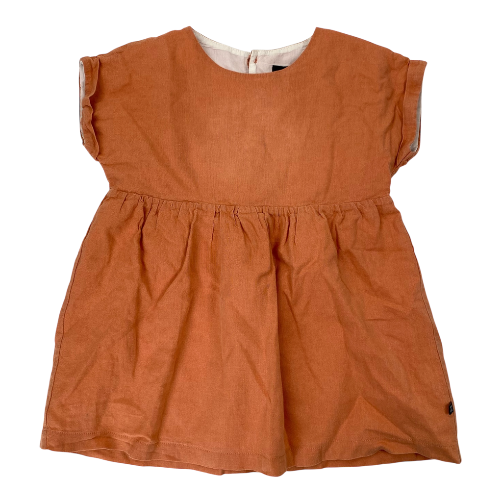 Kaiko short sleeve linen blend empire dress with buttons in the back.