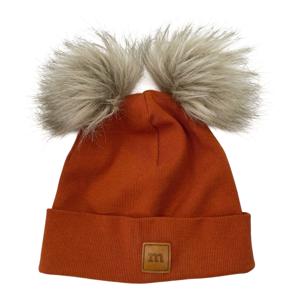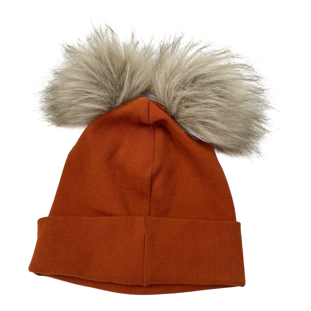 Metsola beanie with two fake fur poms and strings to tie with.