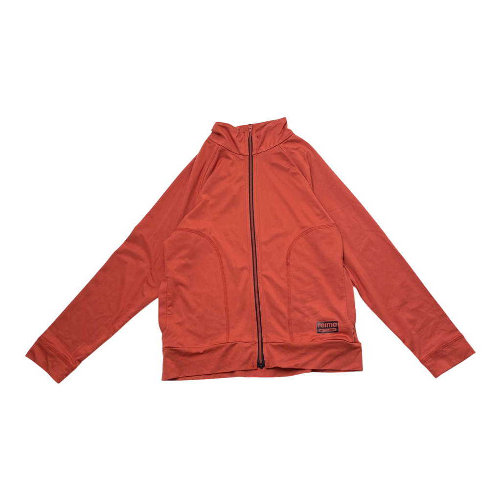 Reima Harkat zipper sweater with pockets on the sides. The sweater is made from xylitol cool material that stretches four ways and is finished in a cooling treatment. Thumbholes in the cuffs keep the sleeves in place. The item comes in a fitted shape. The finishing treatment in reima's xylitol cool material creates a cooling sensation against skin. It also makes the skin surface temperature drop by 1 to 3 degrees!