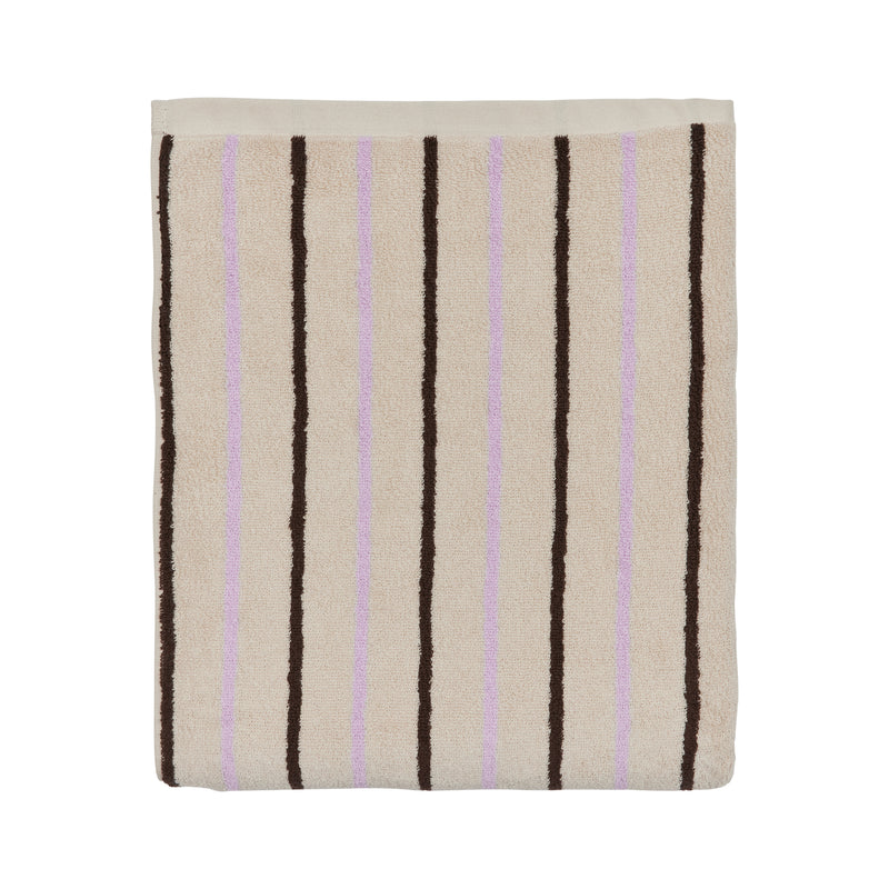 Create a personal expression with towels and wash towels from the beautiful Raita series. The series is characterized by its striped design that is timeless and fit beautifully into any bathroom. The name is not random as Raita means stripe in Finnish.The Raita Towel in Purple/Clay/Brown is made of organic cotton terry and is just what you need after a relaxing shower.We recommend soaking the towel in cold water overnight before the first wash. This improves the ability to absorb water.Machine wash at 60°Style no. L300660 Material: 100% Organic Cotton Dimensions: H150 x W100 cm