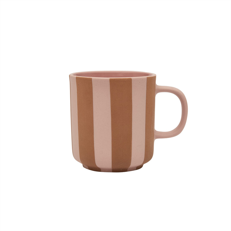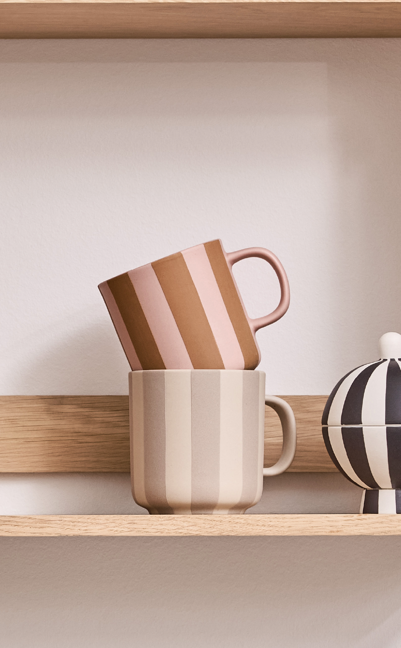 The Toppu Mug is part of the Toppu Series, featuring a hand-painted striped design. Made for everyday use, it is perfect for enjoying hot beverages. Each mug is unique due to the hand-painted finish.