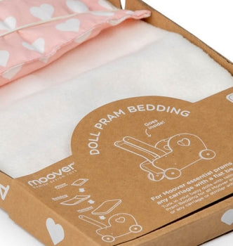 eine allgemeine 3-tlg. Bettwäsche zum spielen für Puppenwagen und Puppen-Betten; passend für alle handelsüblichen Kinderwägen und Betten Maße Verpackung LBH: 22x15x4 cm; Gewicht: 150g Maße Produkt LBH: 43x30 cm ; 21x14 cm; 45x30 cm; Gewicht: 150gMOOVER Toys 3-tlg. Essential Puppenwagenbettwäsche/Bettzeug (pink)Puppenwagen-Zubehör, das speziell für die MOOVER Toys Puppenwagen mit Flachbett als Basis entwickelt wurde und ein bisschen mehr für größere Puppen bietet. Zu der Puppenbettwäsche für Puppenwagen gehören eine Matratze, ein Bettdecke und ein Bettkissen, die aus hochwertigen Stoffen gefertigt wurden, um Ihren Puppenwagen/Buggy zu vervollständigen und ihn für Ihre Puppe besonders gemütlich zu machen. Diese leicht zu waschende Puppenbettwäsche Set eignet sich hervorragend als Geschenk.Erhältlich auch in weiteren Farben (blau und rot), damit beim Spielen mehrere Sets zum Wechseln verfügbar sein können. Einfach und in einer Vielzahl von Farben und Mustern erhältlich, passt diese Bettwäsche auch als Puppenzubehör in jedes Kinderzimmer, selbst wenn er keinen MOOVER Toys Kinderwagen besitzt.Eigenschaften MOOVER Toys Bettzeug 3-teilig:Material: 100% Baumwolle / 100% Polyesterwaschbar: bis 30°3-tlg. bestehend aus Matratze, Bettdecke, Bettkisseneinzigartiges Design: pink mit kleinen weißen Herzenpassend für: alle MOOVER Toys Puppenwagen mit Flachbett als Basissauber verarbeitet und wunderschön gefertigtDetails MOOVER Toys Essential Puppenbettwäsche (pink):Altersempfehlung: 18+ MonateFarbe: pink mit kleinen weißen HerzenMaße Matratze: (LxBxH): ca. 17,5x30 cmMaße Bettdecke (LxBxH):: ca. 25x30cmMaße Bettkissen (LxBxH): ca. 17,5x12 cmMaße Verpackung (LxBxH): ca. 28x20x4 cmGewicht: 150gWeitere Farben MOOVER Toys Bettwäsche für Flachbett (pink):blaurotLieferumfang:MOOVER Toys Puppen/Kinderwagen-Bettwäsche Essential, 3-teilig in pinkMOOVER Ersatzteile-ServiceWir bieten einen MOOVER Toys Ersatzteilservice gegen Vorkasse. Einfach per Mail bestellbar an info@kinderfahrzeug-onlineshop.de - und nicht vergessen! Bitte senden sie uns neben der Produktbezeichnung ein Foto der Batchnummer (diese finden Sie auf der Radinnenseite) und Produktfoto mit defekten Teil per Mail! Preise auf Anfrage zzgl. Bearbeitung & Versandkostenpauschale.Passende Bettwäsche finden Sie unter:MOOVER Puppenwagen Bettwäsche 3-tlg. Essential (blau) Art.Nr.: MOOV-882392MOOVER Puppenwagen Bettwäsche 3-tlg. Essential (rot) Art.Nr.: MOOV-882385