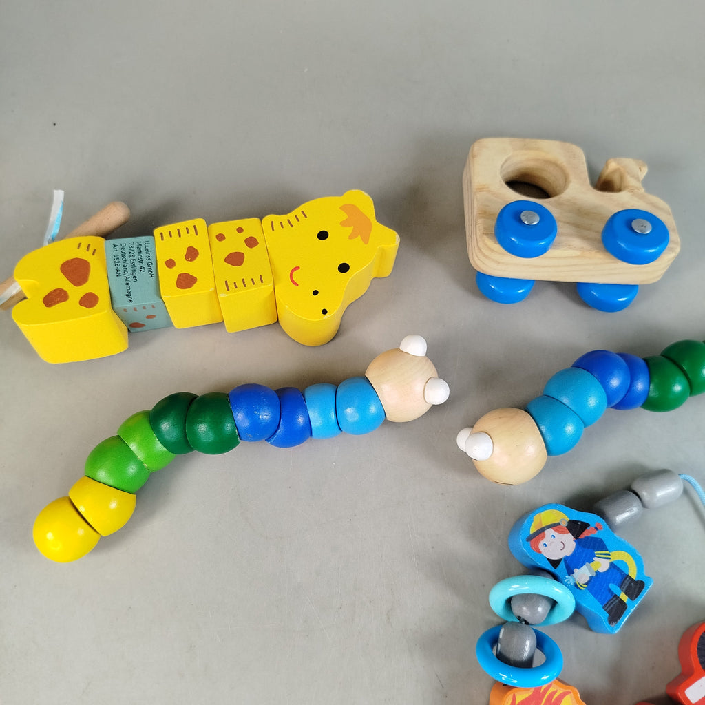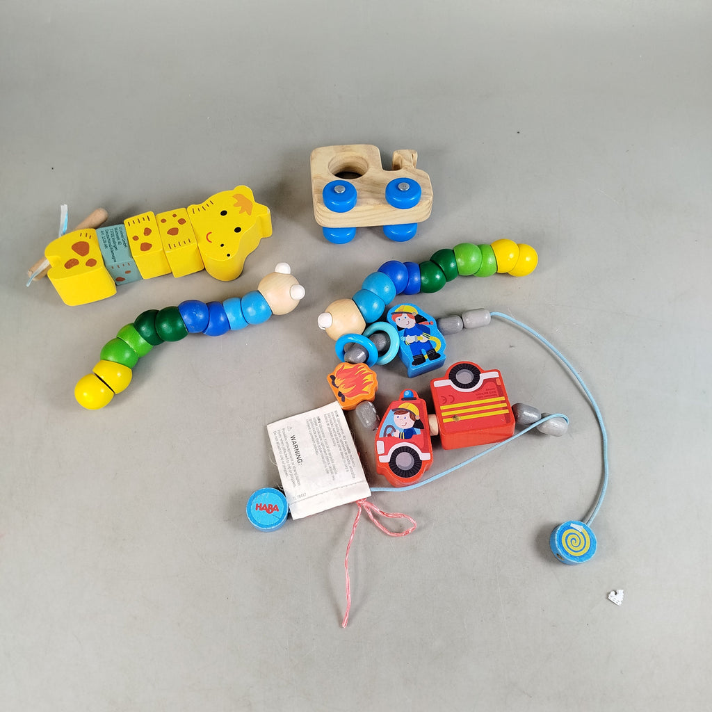 Das HABA Holzspielzeug-Set umfasst ein Fädelspiel mit Feuerwehr-Motiv, zwei Greifraupen, eine Giraffe sowie ein Auto. Dieses ökologische Spielzeug fördert spielerisch die Motorik und die Konzentration von Kindern. Altersempfehlung: 1–2 Jahre. Achtung: Nicht für Kinder unter 12 Monaten geeignet, Erstickungsgefahr durch kleine Teile.