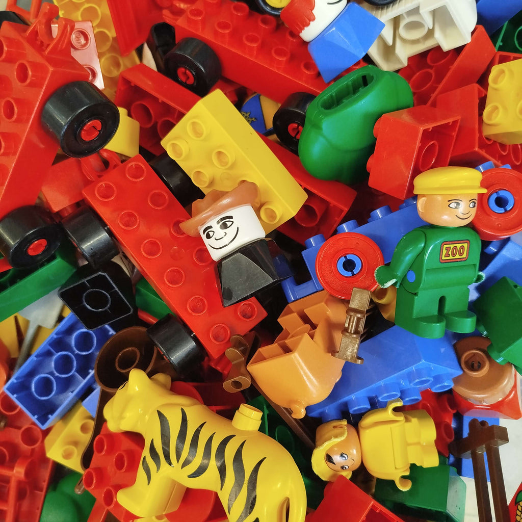 Das LEGO Duplo Konvolut mit einem Gesamtgewicht von 2 kg enthält verschiedene Duplo Steine und Figuren, darunter ein graues Pferd, eine gelbe Tigerfigur, eine Radmontage sowie mehrere Minifiguren, darunter eine Figur mit grünem Oberteil und der Aufschrift 'ZOO'. Die Bausteine fördern motorische Fähigkeiten und kreatives Bauen. Altersempfehlung: 3–5 Jahre. Achtung: Nicht für Kinder unter 3 Jahren geeignet, Erstickungsgefahr durch Kleinteile.