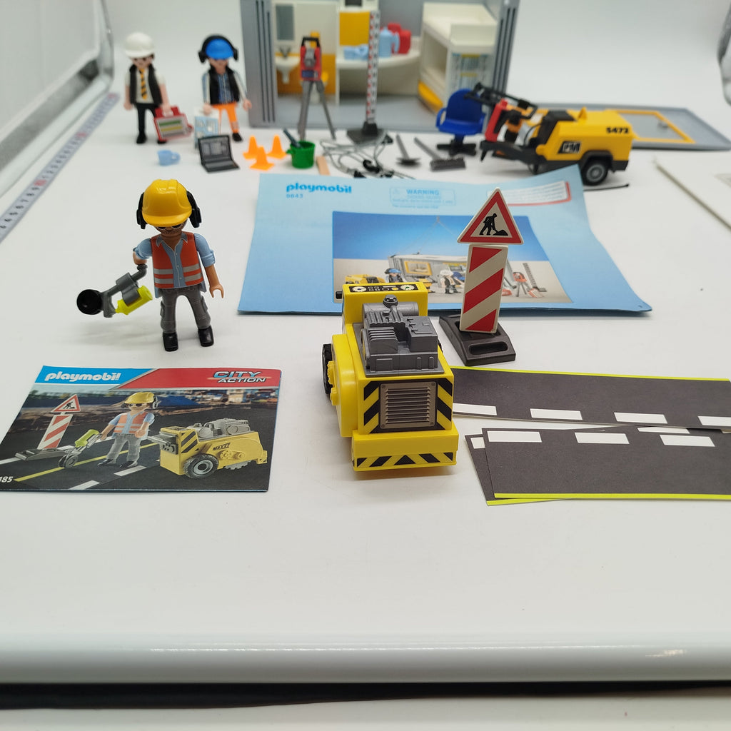 Hol dir das Playmobil City Action Bauset mit Baucontainer, Fahrzeug 5472 und Zubehör. Enthalten sind mindestens drei Bauarbeiterfiguren, Verkehrsleitkegel, Schaufeln, Besen, Eimer und ein Laptopteil. Der Container bietet Einrichtung mit Toilette, Stockbett und Waschbereich. Ideal für kleine Baustellenfans und kreatives Spielen. Das Spielzeug befindet sich in neuwertigem Zustand, Verpackung fehlt. Die Vollständigkeit konnte nicht überprüft werden. Hinweis: Enthält Kleinteile, nicht geeignet für Kinder unter 3 Jahren.