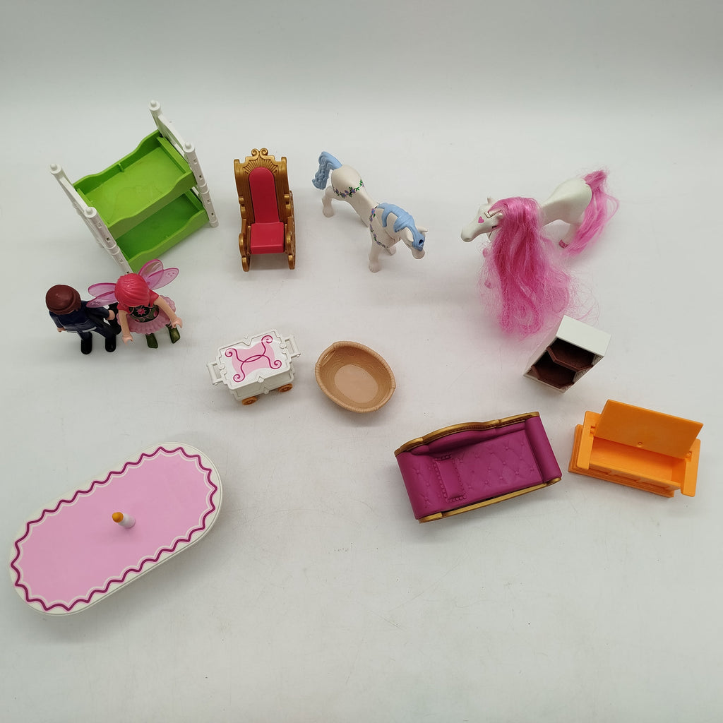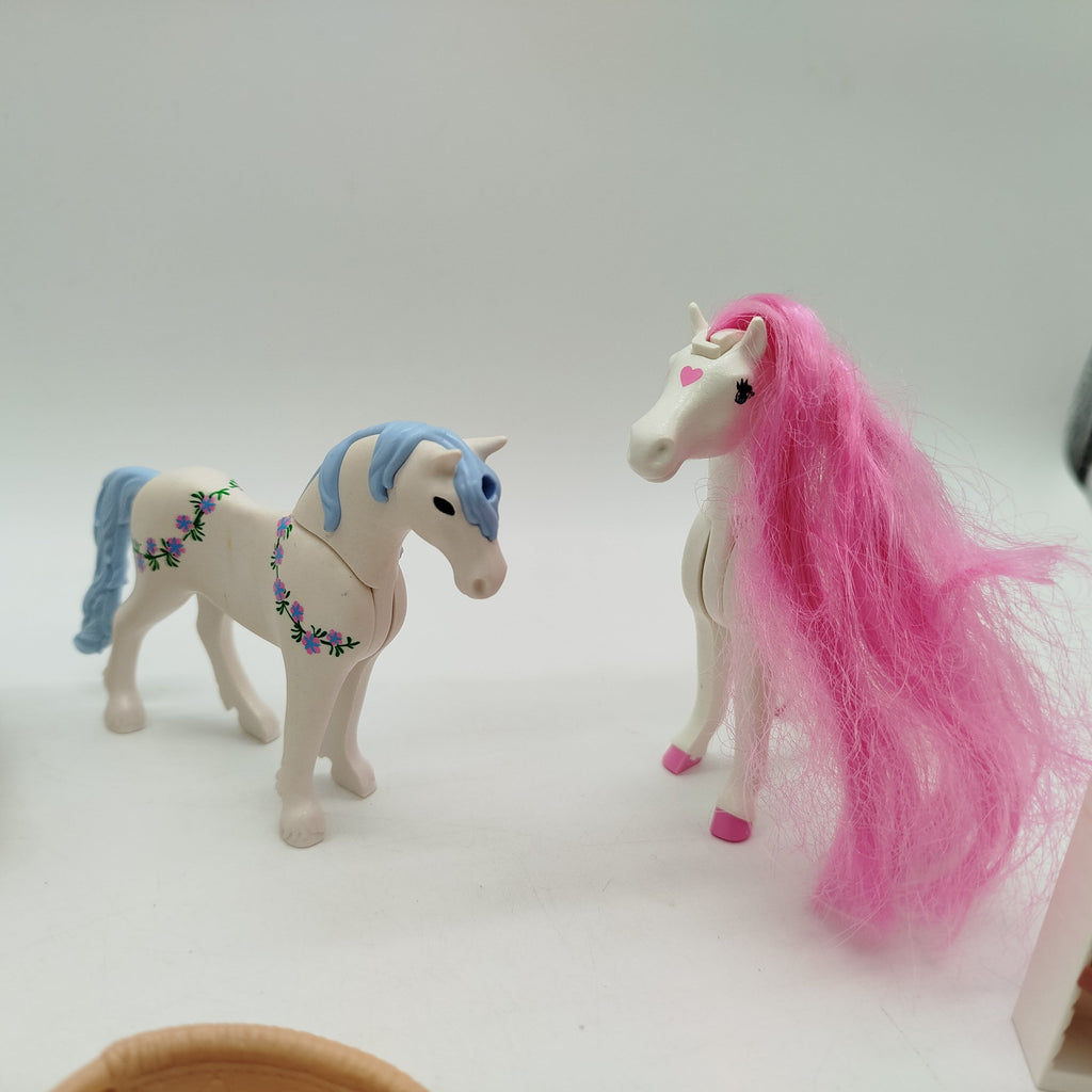 Hol dir dieses detailreiche Figuren- und Möbel-Set im Stil von Playmobil, bestehend aus zwei Figuren, Zubehörteilen wie Bett, Stühlen, Tischen und zwei Pferden mit farbigen Mähnen. Ideal für fantasievolle Rollenspiele und kreatives Gestalten. Das Spielzeug zeigt nur geringe Gebrauchsspuren, die Vollständigkeit konnte nicht überprüft werden. Gib diesem Spielzeug ein neues Zuhause und freu dich auf viele neue Abenteuer!