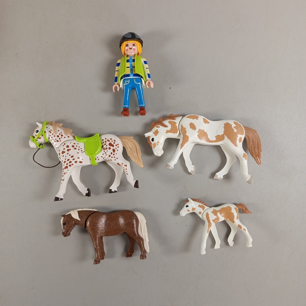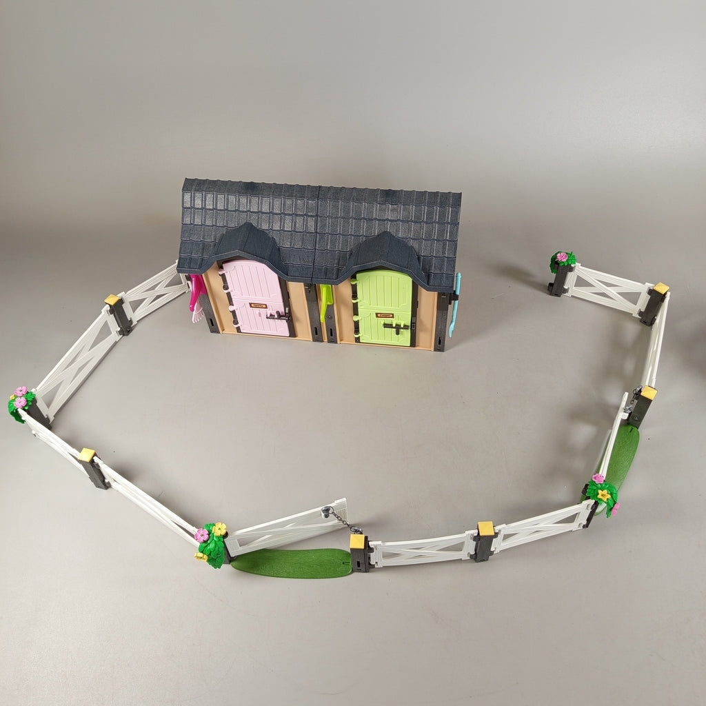 Hol dir den Playmobil Pferdestall 6948 mit Figuren und Zubehör für spannende Bauernhofabenteuer! Das Set enthält 1 Playmobil-Figur, 4 Pferde, einen Stall mit farbigen Türen, Zaunelemente, Bäume, eine Vogelscheuche, einen Eimer und einen Heuballen. Die OVP fehlt, der Zustand ist sehr gut mit leichten Gebrauchsspuren. Die Vollständigkeit konnte nicht überprüft werden. Gib diesem Spielzeug ein neues Zuhause und fördere fantasievolles Spielen! Hinweis: Enthält Kleinteile, nicht geeignet für Kinder unter 3 Jahren.