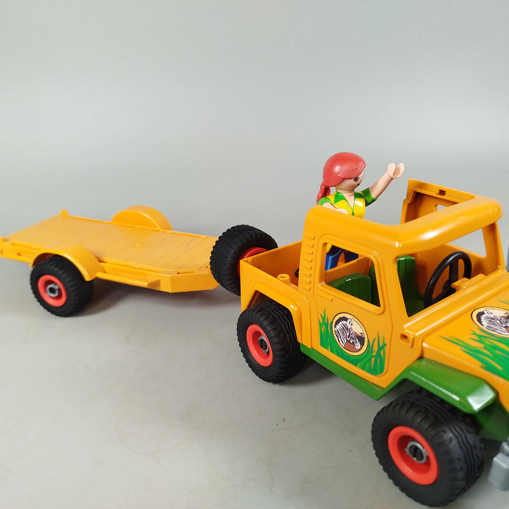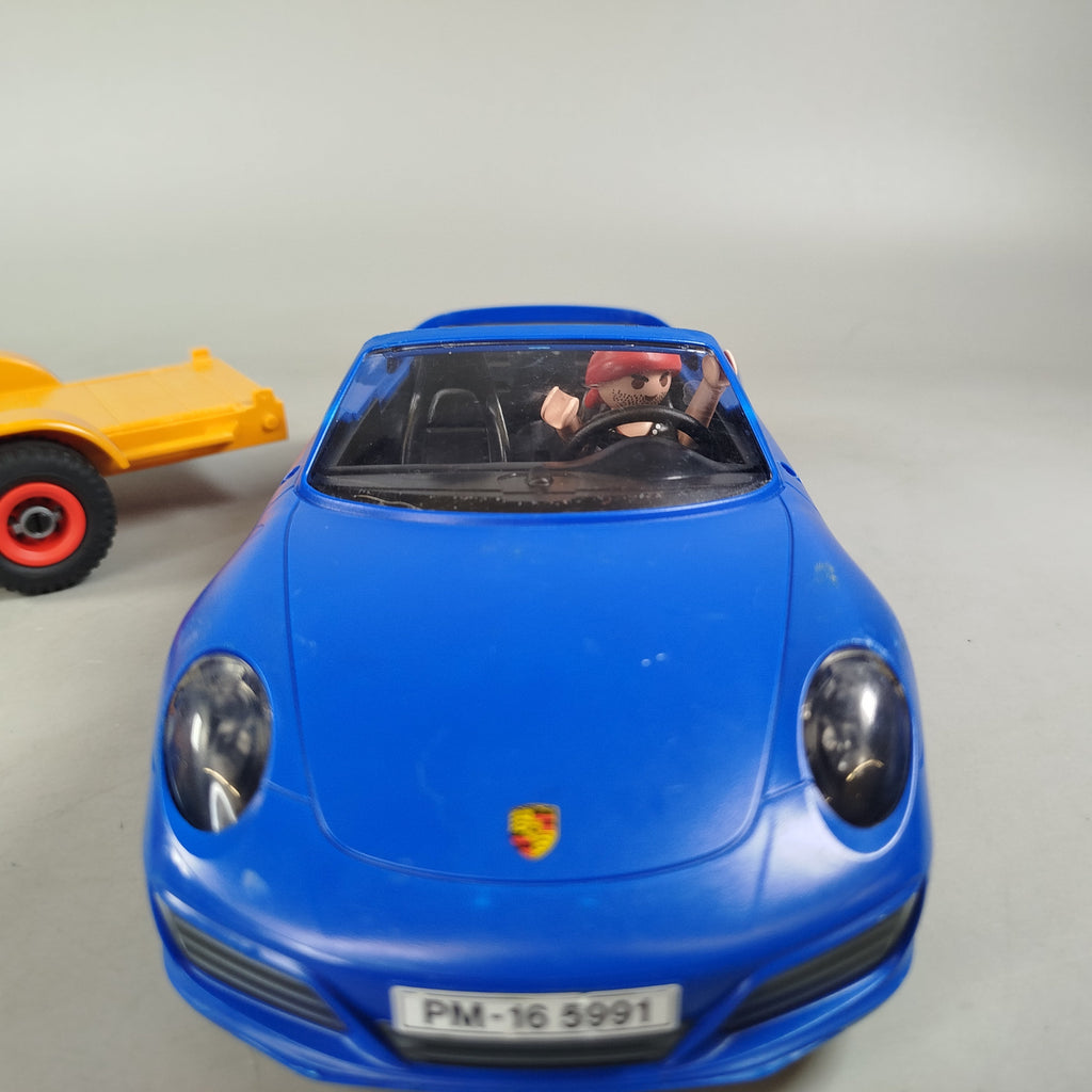 Hol dir das Playmobil Fahrzeug-Set mit coolem blauen Porsche Cabrio, einem gelb-grünen Offroader im Zebra-Look und einem orangefarbenen Anhänger. Zwei Playmobil-Figuren sorgen für Spielspaß und Abenteuer. Mit CE-Kennzeichnung. OVP fehlt, Gebrauchsspuren sichtbar. Vollständigkeit konnte nicht überprüft werden.