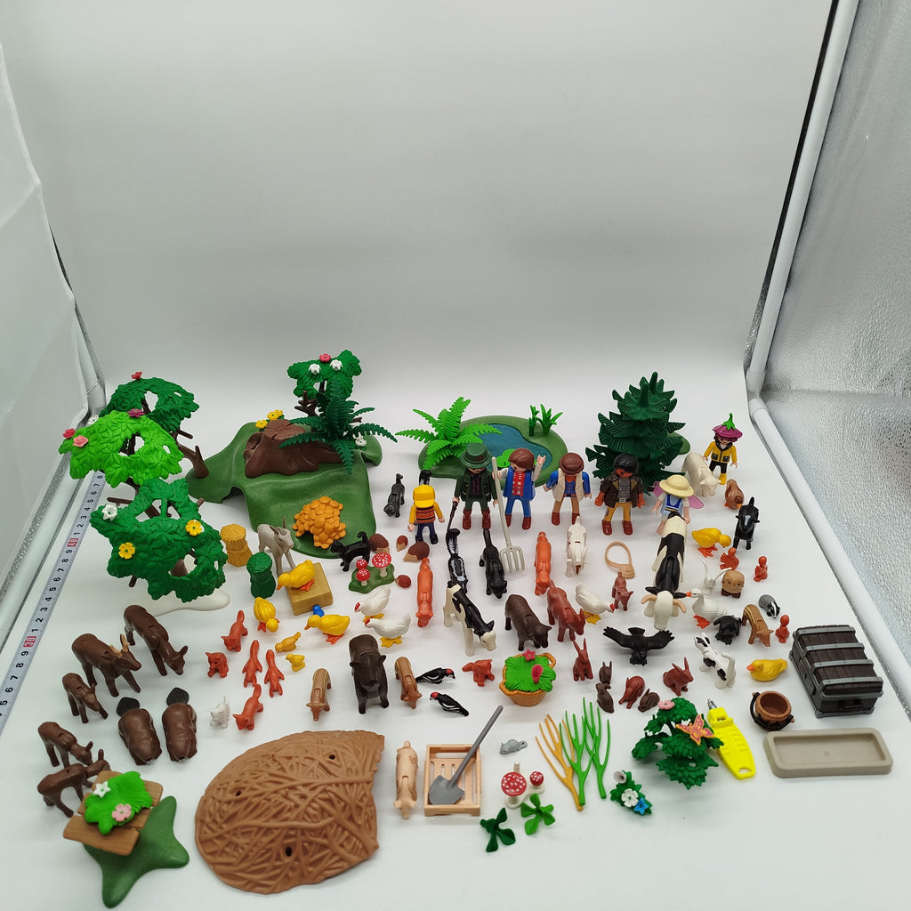 Hol dir das umfangreiche Playmobil Figuren-Set mit vielen Tieren, Menschen und Zubehör für fantasievolle Rollenspiele! Das Set enthält über 7 menschliche Figuren, mehr als 40 Tierfiguren wie Kühe, Schweine, Hunde, Vögel, Füchse und Rehe sowie zahlreiche Zubehörteile wie Bäume, Pflanzen, Werkzeuge, Teiche und Landschaftselemente. Verpackung fehlt, aber das Spielzeug ist gut erhalten und zeigt nur leichte Gebrauchsspuren. Die Vollständigkeit konnte nicht überprüft werden. Ideal für kreative Kinder und Sammler, die ihren Playmobil-Welten neues Leben einhauchen möchten. Hinweis: Enthält Kleinteile, nicht geeignet für Kinder unter 3 Jahren. Erstickungsgefahr!
