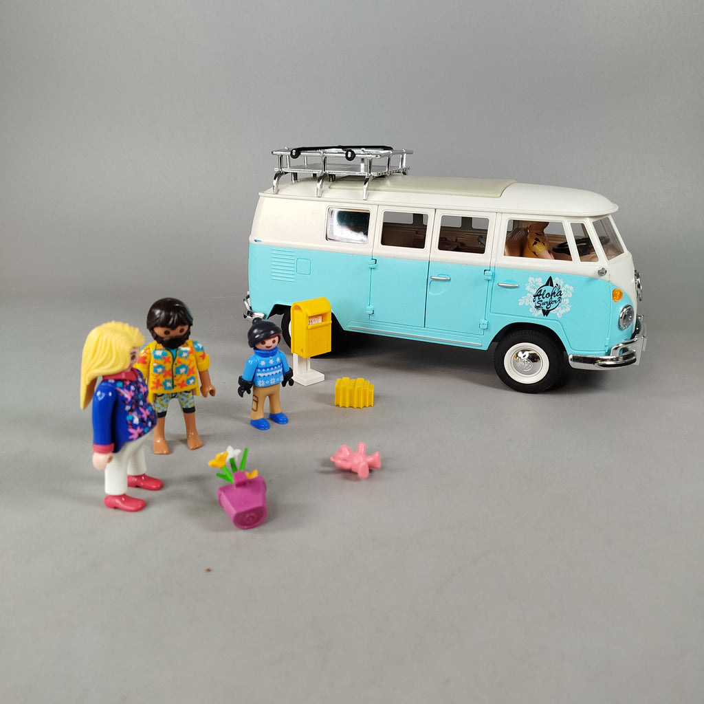 Hol dir das Playmobil Spieleset mit einem detailreichen VW Bus im Aloha-Design und vier Figuren. Zum Set gehören außerdem ein gelber Briefkasten, ein pinkes Teddybär, ein lila Blumentopf mit Blumen und ein gelbes Faltteil. Perfekt für fantasievolle Rollenspiele und kreative Abenteuer. Das Spielzeug befindet sich in einem sehr guten gebrauchten Zustand. Die Vollständigkeit konnte nicht überprüft werden. Gib diesem Spielzeug ein neues Zuhause und schenke ihm ein zweites Leben!