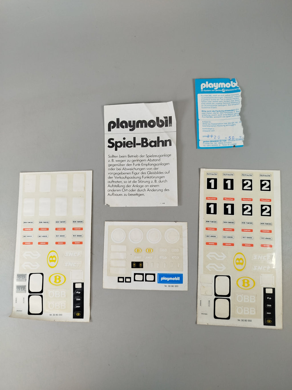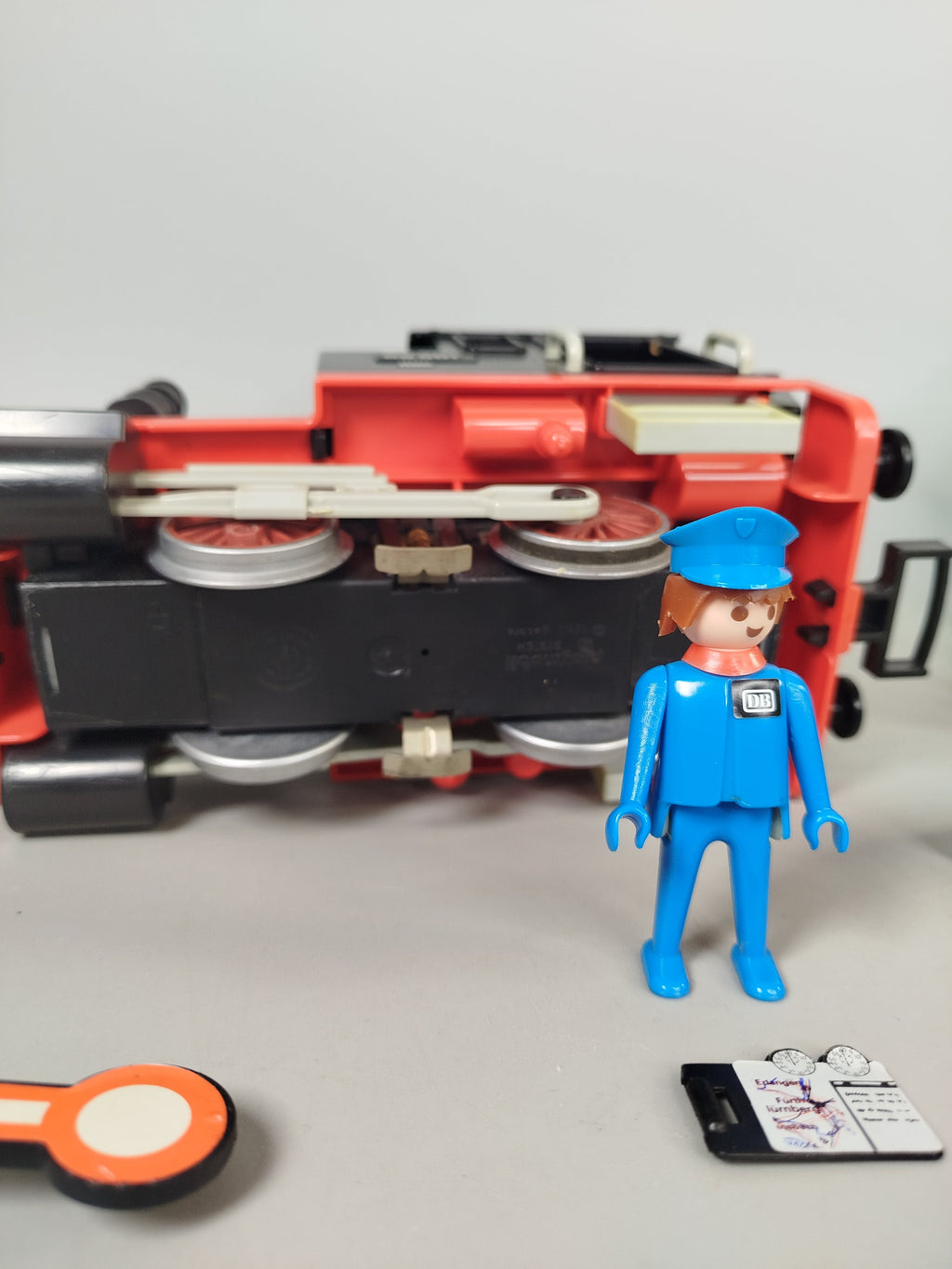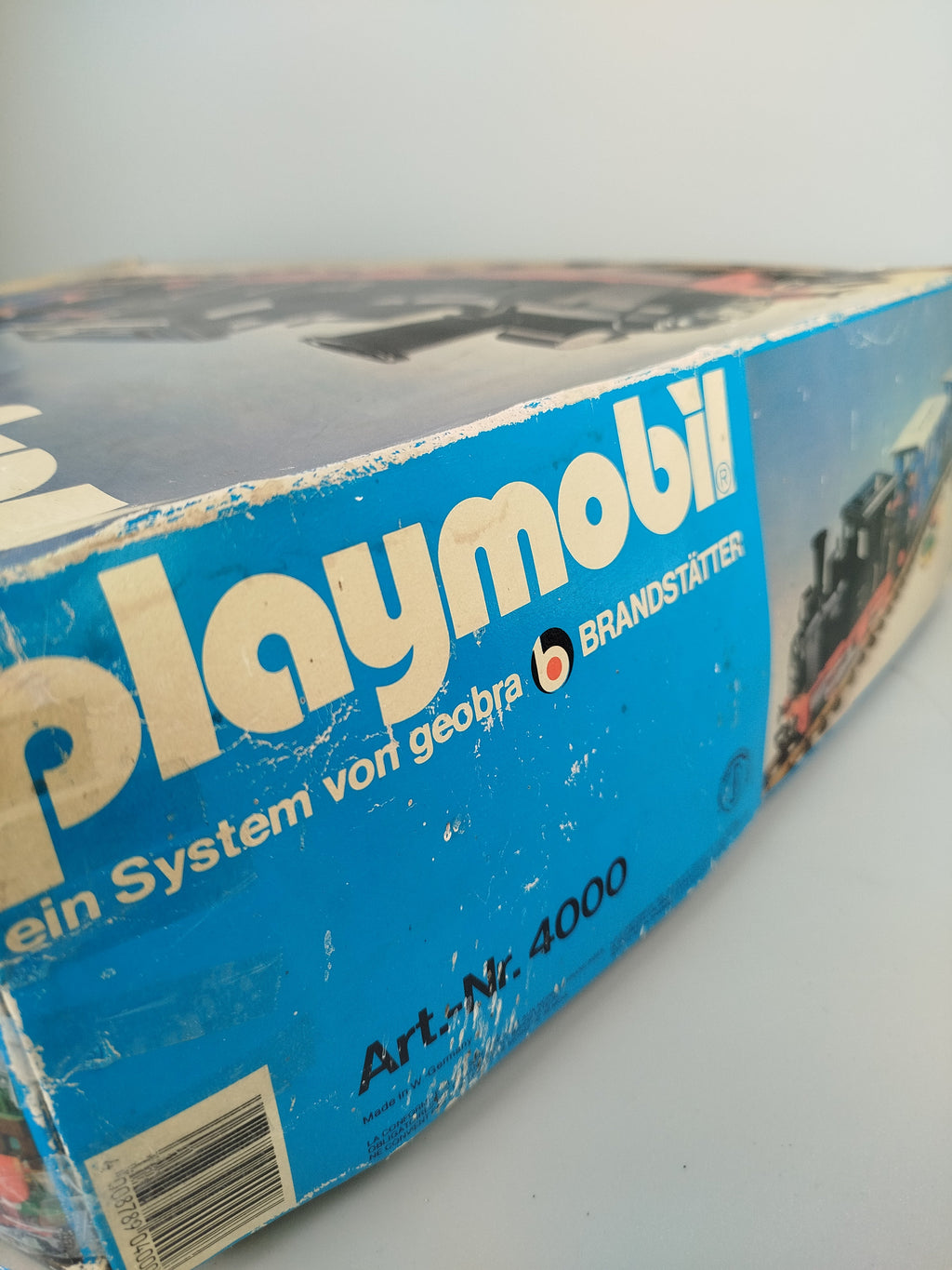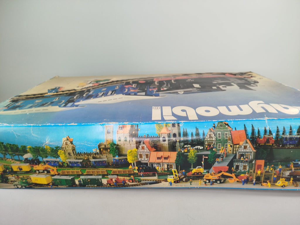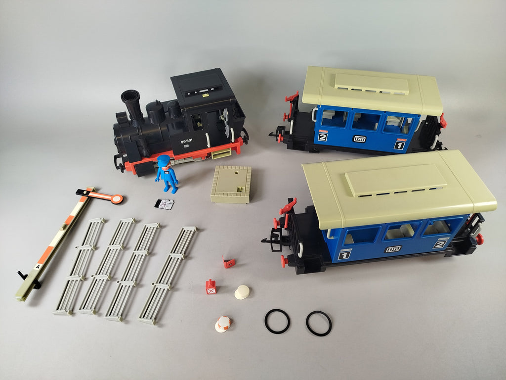 Hol dir die klassische Playmobil Eisenbahn mit der Dampflok 4000( 1980) in originaler DB-Ausführung und erlebe nostalgische Zugabenteuer. Enthalten sind die Lokomotive, zwei Personenwagen, Gleise sowie eine Schaffnerfigur. Die Originalverpackung ist vorhanden, zeigt jedoch altersbedingte Gebrauchsspuren. Einzelne Teile wie Innenelemente eines Wagens fehlen, daher ist das Set unvollständig. Das Spielzeug befindet sich insgesamt in einem sehr guten Zustand mit leichten Kratzern und Staubrückständen. Die Räder der Lokomotive bewegen sich nicht. Ein Transformator wird zum Betrieb benötigt, ist aber nicht im Lieferumfang enthalten. Auch die Anleitung fehlt.Hinweis: Nicht für Kinder unter 3 Jahren geeignet, da Kleinteile verschluckt werden können.
