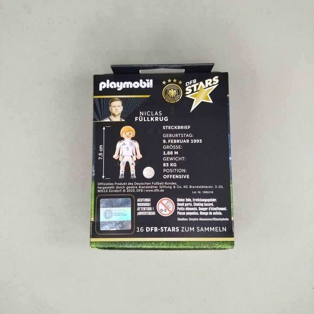 Hol dir die Playmobil DFB Star Figur von Niclas Füllkrug und feiere den deutschen Fußball! Diese detailreiche Sammlerfigur in limitierter Auflage zeigt Füllkrug im DFB-Trikot und ist Teil der exklusiven Serie mit 16 Stars. Die Figur ist ca. 7,5 cm groß, wird in Originalverpackung geliefert und ist komplett mit Anleitung. Perfekt für Fans und Sammler. Das Spielzeug befindet sich in neuem Zustand. Hinweis: Nicht für Kinder unter 3 Jahren geeignet, da Kleinteile verschluckt werden können.