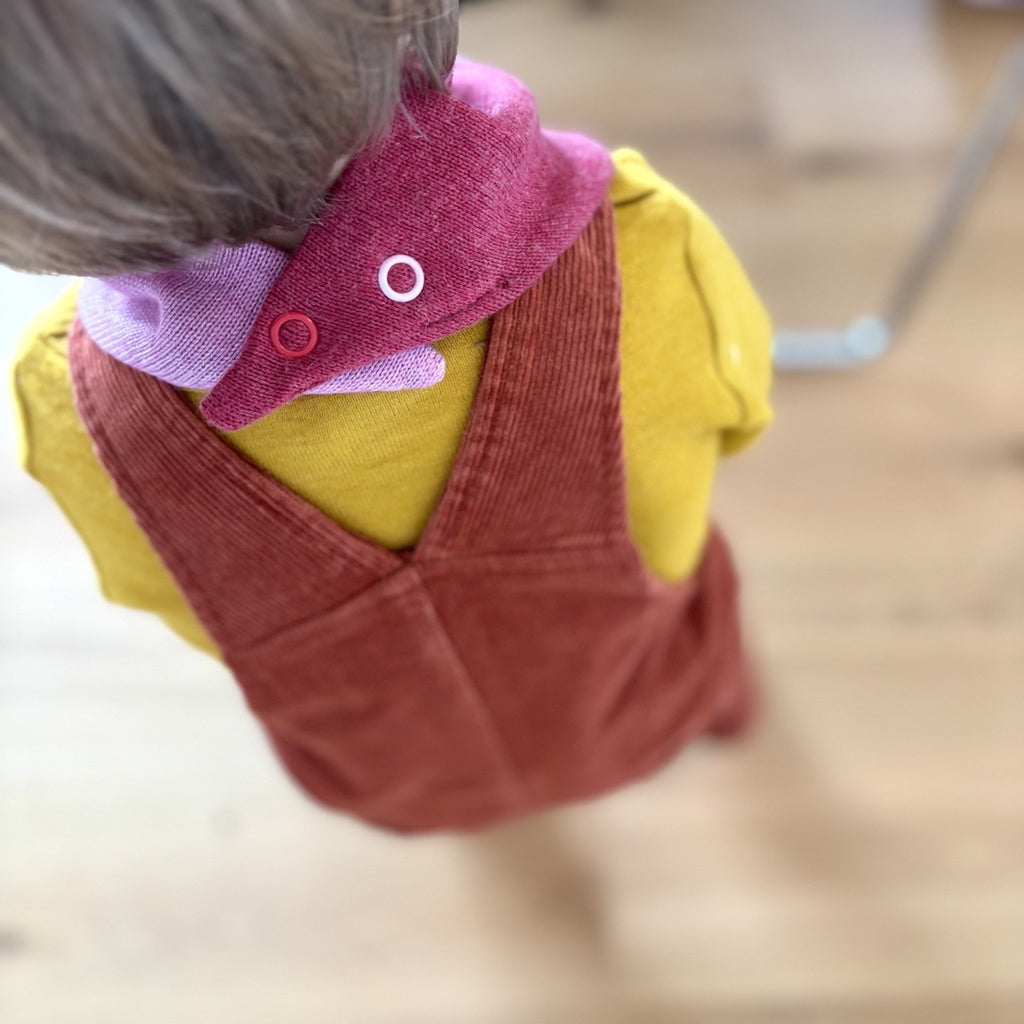 Mit den zwei Stufen der feinen Messingdruckknöpfe lässt sich das WollfairTüchlein in Form eines Dreieckstuches ganz leicht schließen. So begleitet es auch größere Kinder beim Spielen, Entdecken oder Kuscheln.