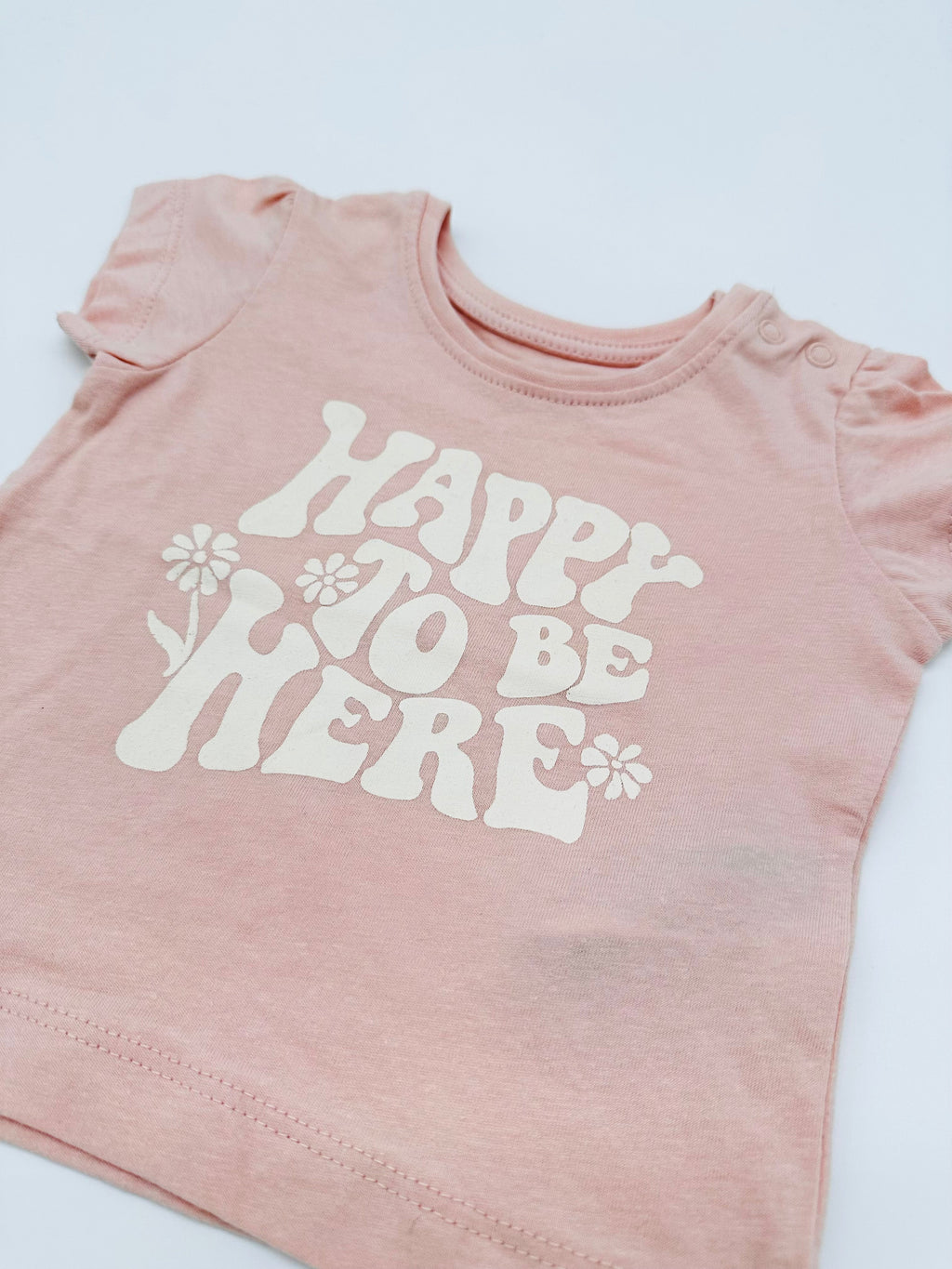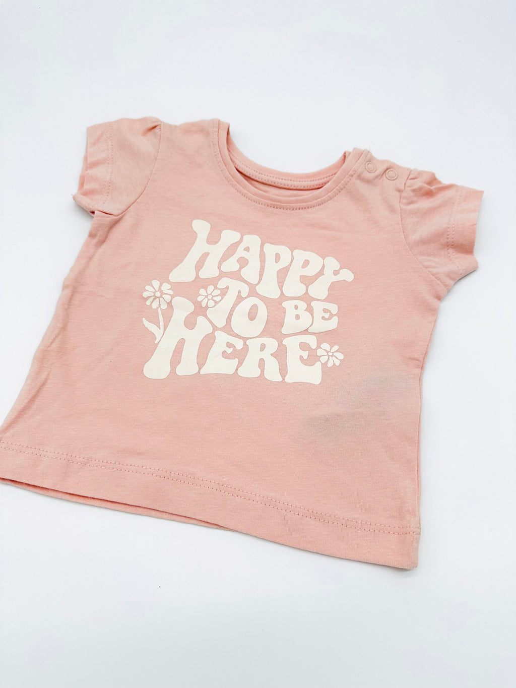 Fröhliches T-Shirt von Primark in zartem Rosé mit großem Retro-Print „Happy to be here“. Der verspielte Schriftzug mit kleinen Blümchen macht das Shirt zu einem echten Gute-Laune-Teil, das perfekt für sonnige Tage geeignet ist.