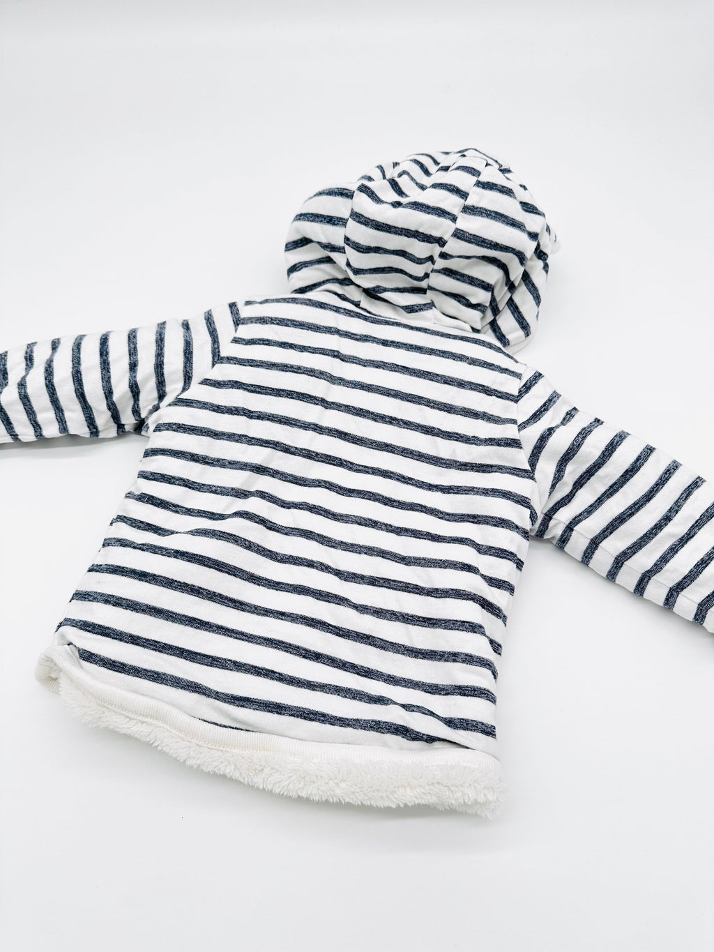 Diese kuschelige Babyjacke von H&M ist der perfekte Begleiter für kühlere Tage und die Übergangszeit. Das zeitlose Streifen-Design in Weiß und Dunkelblau wirkt klassisch und neutral und lässt sich vielseitig zu jedem Outfit kombinieren – ideal für Alltag, Spaziergänge oder den Weg zur Kita.