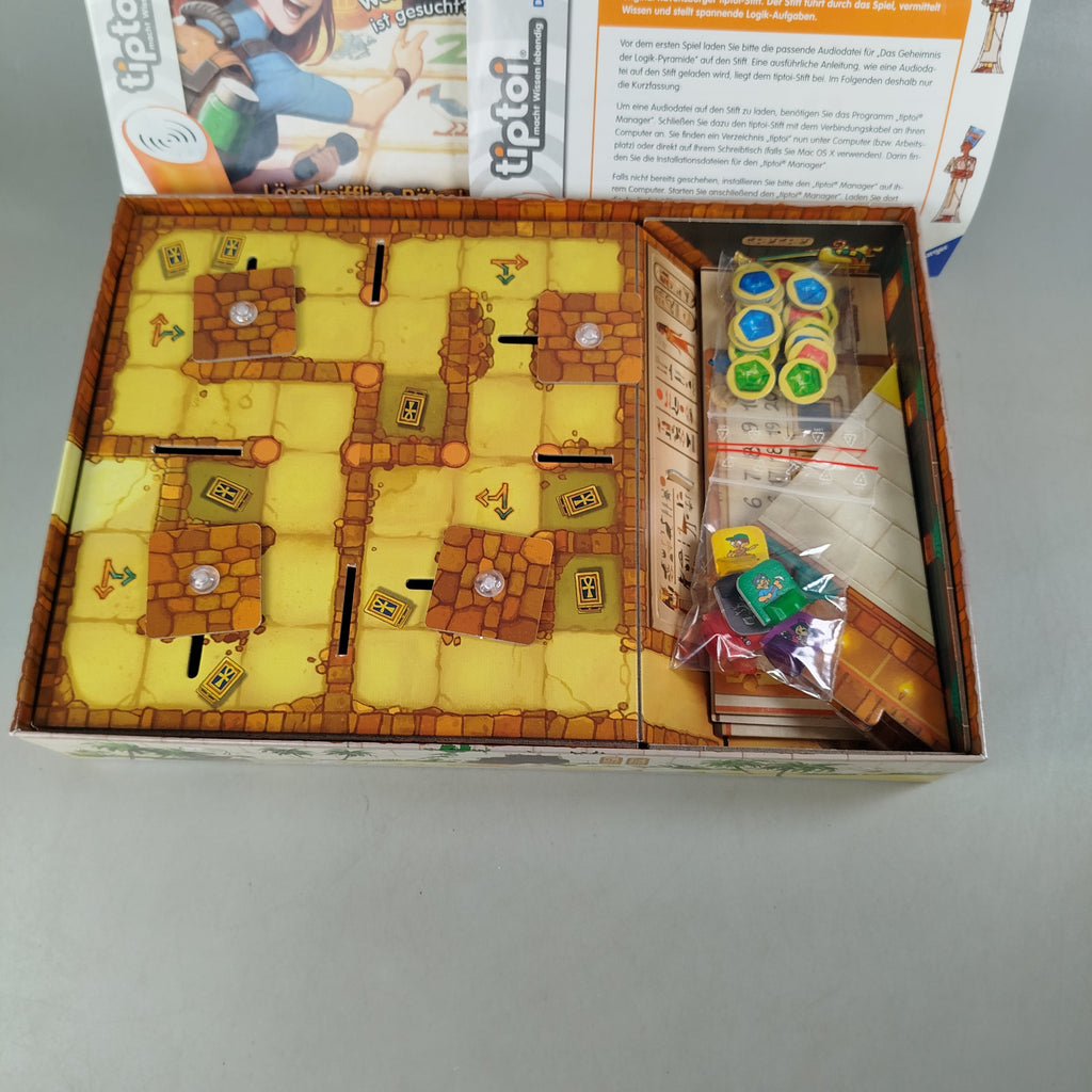 Hol dir das Das Geheimnis der Logik-Pyramide von Ravensburger und tauch in spannende Zahlenrätsel ein. Das interaktive Brettspiel aus dem tiptoi Lernsystem dreht sich um logisches Denken, Kombinieren und das Lösen kniffliger Aufgaben rund um eine dreidimensionale Pyramide. Gespielt wird mit Spielfiguren, Würfeln und weiterem Spielmaterial, während der tiptoi Stift durch Fragen und Aufgaben führt und Wissen vermittelt. Gib diesem Spielzeug ein neues Zuhause und unterstütze nachhaltiges Spielen. Hinweis: Zum Spielen wird ein tiptoi Stift benötigt, der nicht enthalten ist. Sicherheitshinweis nach GPSR: Enthält Kleinteile, nicht geeignet für Kinder unter 3 Jahren.