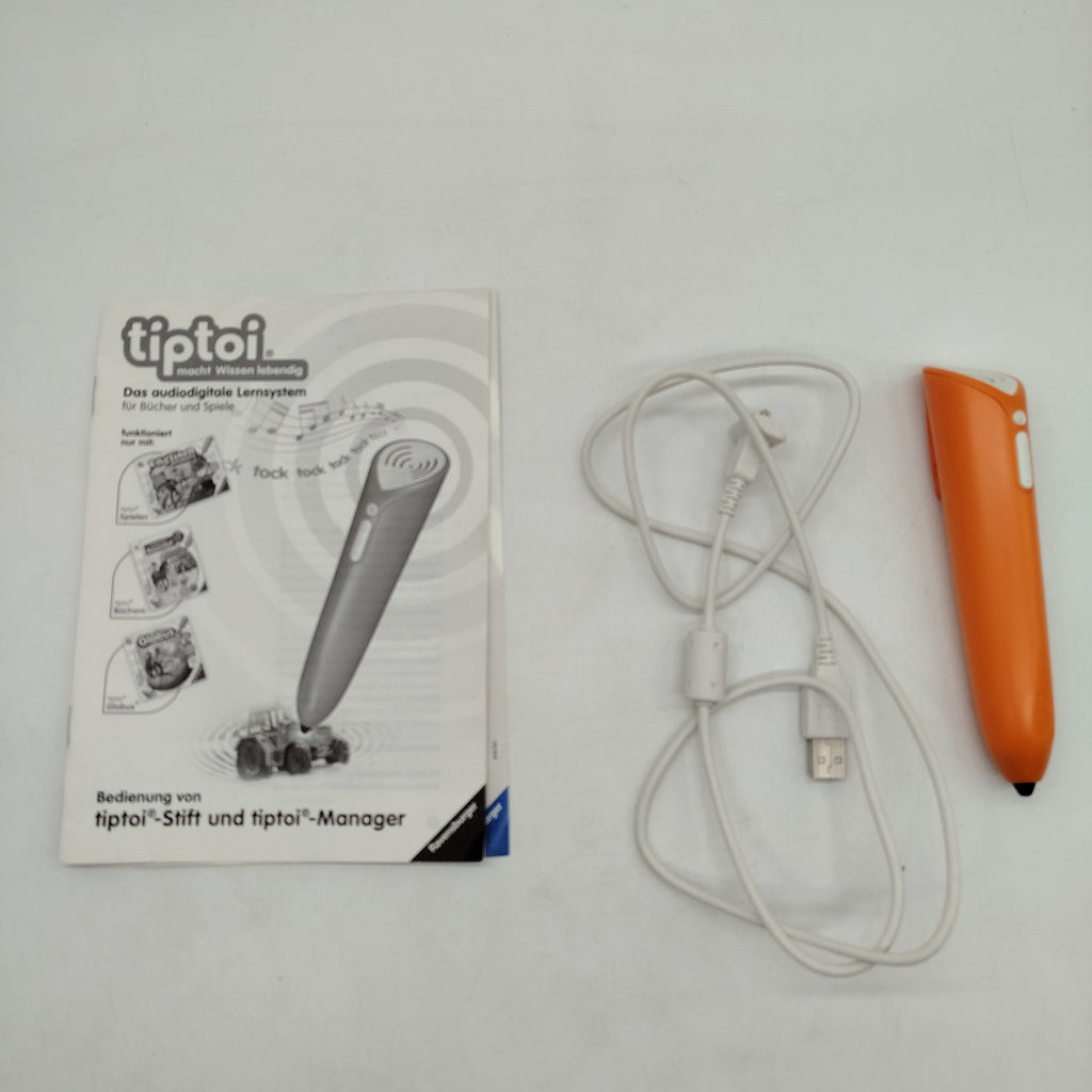 Hol dir das tiptoi Lernsystem von Ravensburger und bring spielerisches Lernen ins Kinderzimmer! Dieses audiodigitale Lernspielzeug besteht aus einem orangefarbenen elektronischen Stift mit Lautsprecher, Lautstärkeregelung, Kopfhöreranschluss, Mini-USB-Anschluss sowie einem weißen USB-Kabel und einer deutschsprachigen Bedienungsanleitung für tiptoi-Stift und tiptoi-Manager. Der Stift wird verwendet, um mit tiptoi Büchern und Spielen interaktiv Wissen zu entdecken und eignet sich ideal für neugierige Kinder im Vorschul- und Grundschulalter. Gib diesem tollen Lernspielzeug ein neues Zuhause und schenke ihm ein zweites Leben! Im Lieferumfang enthalten sind genau 1 tiptoi Stift, 1 USB-Kabel und 1 Anleitung. Eine Originalverpackung ist nicht enthalten. Das Spielzeug befindet sich in einem guten gebrauchten Zustand. Die Vollständigkeit bezieht sich ausschließlich auf den beschriebenen Lieferumfang. Empfohlen für Kinder ab ca. 4 Jahren. Hinweis gemäß GPSR: Enthält elektronische Bauteile und Kleinteile, nicht geeignet für Kinder unter 3 Jahren – Erstickungsgefahr!