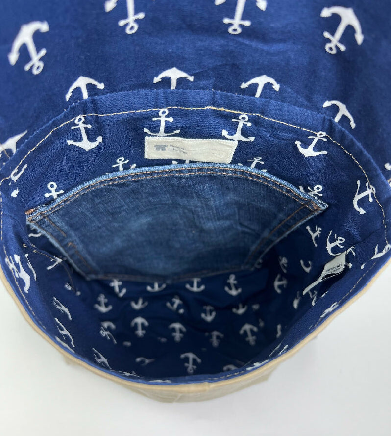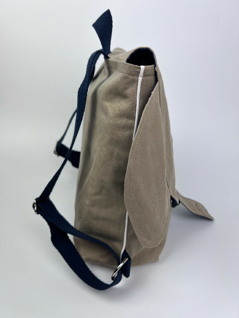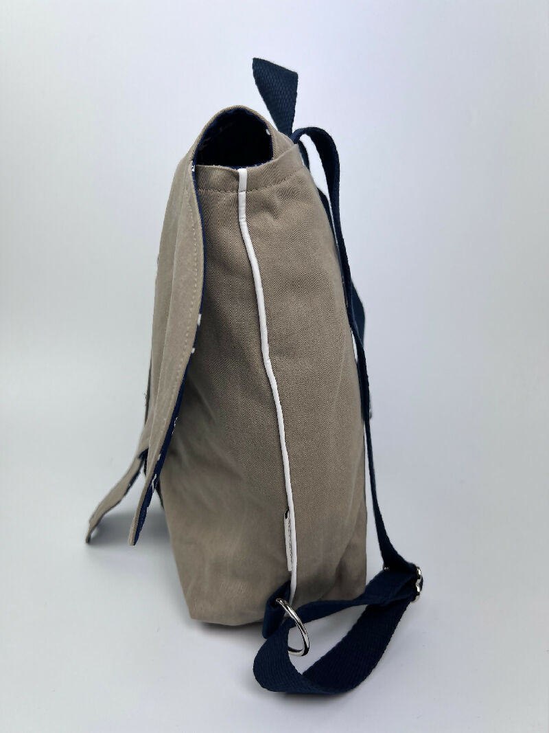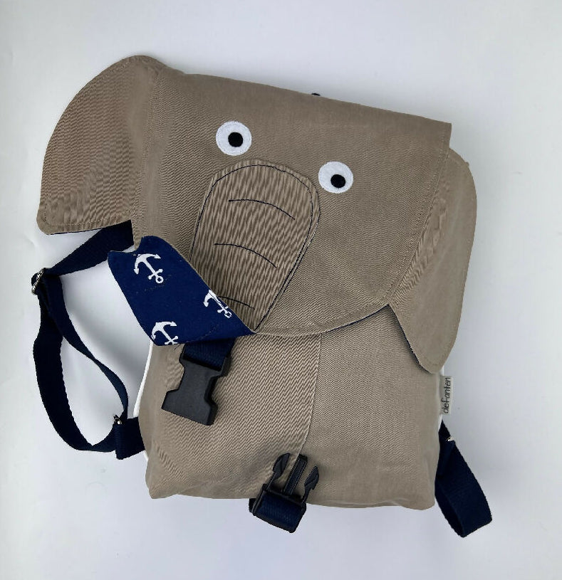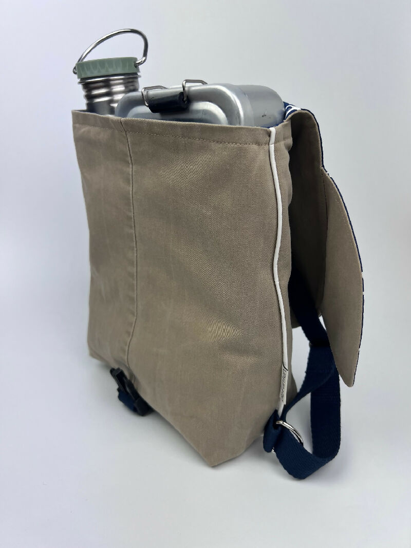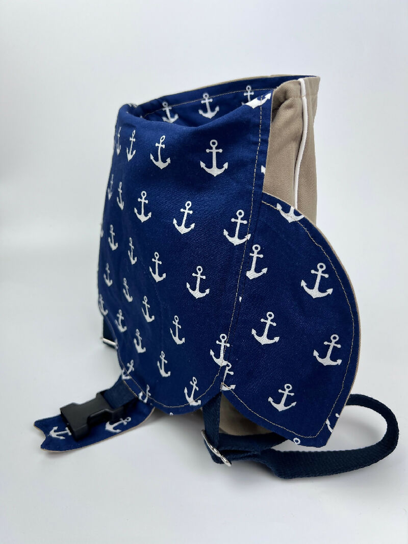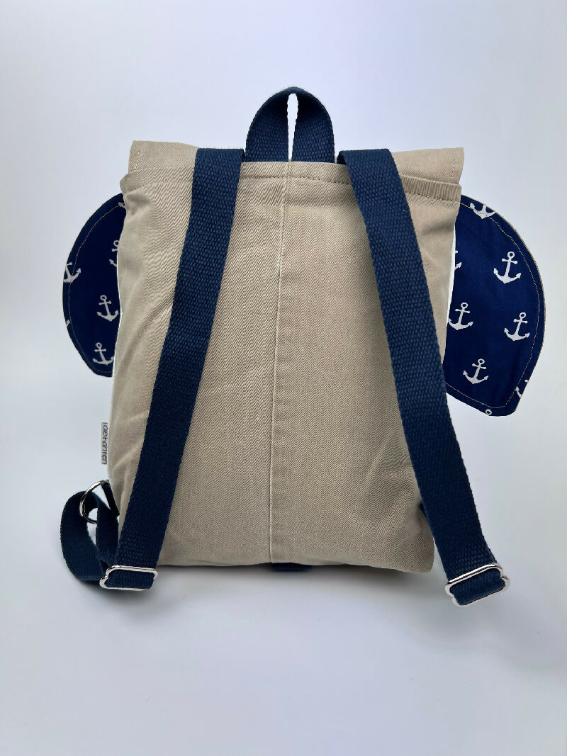 Kinderrucksack aus einer beigen Chinohose mit Innentasche und verstellbaren Gurten und einem marineblauen Futter mit weißen Ankern. An den Seiten wurde ein Reflex-Paspelband zur besseren Sichtbarkeit im Dunkeln eingearbeitet. Der Rucksack wird mit einer Steckschnalle verschlossen, die sich sehr einfach von Kinderhänden öffnen und schließen lässt. Olefanten Rucksäcke sind schön handlich und eignen sich perfekt für die Kita oder den Kindergarten.