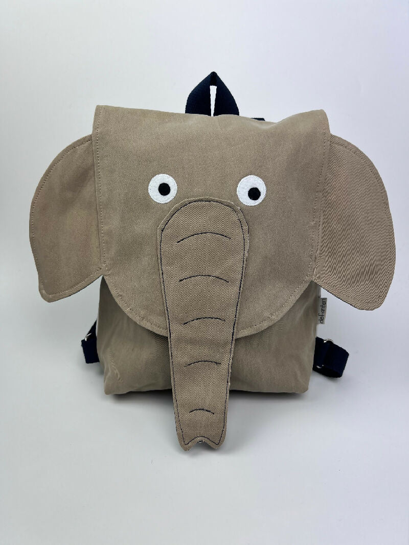 Für die Aufhänger und Tragegurte wurden Baumwollband und Metallringe/-schnallen verarbeitet. Eine Steckschnalle aus recyceltem Kunststoff verschließt den Rucksack. Die Augen bestehen aus Filz und die Rucksackklappe wurde mit einer Bügeleinlage aus Baumwolle verstärkt.