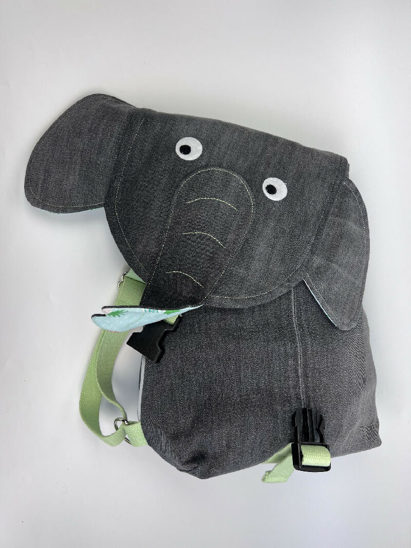 Für die Aufhänger und Tragegurte wurden Baumwollband und Metallringe/-schnallen verarbeitet. Eine Steckschnalle aus recyceltem Kunststoff verschließt den Rucksack. Die Augen bestehen aus Filz und die Rucksackklappe wurde mit einer Bügeleinlage aus Baumwolle verstärkt.