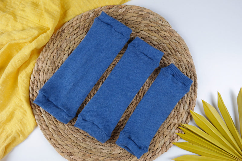 These blue leg warmers for babies and toddlers were once a wool sweater (55% silk, 45% cashmere).