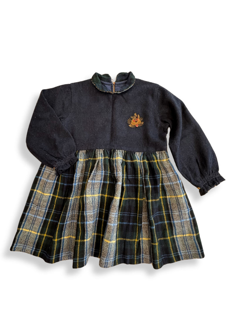 Dieses klassische Kleid kombiniert ein dunkelblaues Oberteil mit typisch britischem Karo-Muster im Rock. Das Oberteil ist aus warmem Wollstoff gefertigt und zeigt kleine Stickereien für einen verspielten Akzent. Die Kombination aus traditionellen Stoffen und Mustern macht dieses Set zu einem echten Hingucker. Gekauft bei nickis.com, NP: > 400€