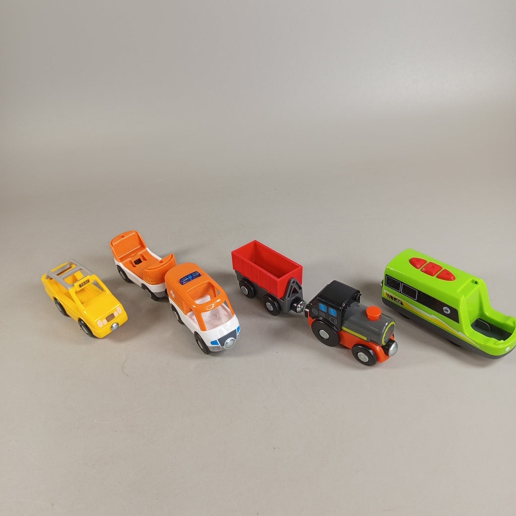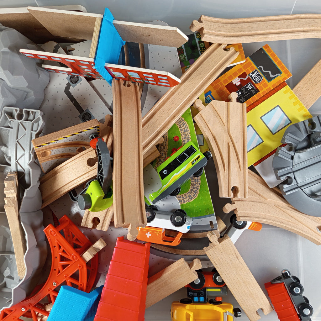 Hol dir die Playtive Junior Holzeisenbahn und erlebe spannende Abenteuer auf der Schiene! Dieses Set enthält mehrere Fahrzeuge, darunter eine grüne Metro-Lok, ein roter Kipplaster, Taxi, Krankenwagen, Van und schwarze Lok. Neben den Zügen sind Holzschienen, Brücken, Gebäude und Landschaftsteile enthalten. Einige Schienen und Zugteile fehlen, die Vollständigkeit ist daher teilweise. Die Verpackung und Anleitung sind nicht vorhanden. Das Spielset zeigt leichte Gebrauchsspuren, befindet sich aber insgesamt in gutem Zustand. Gib diesem Holzspielzeug ein neues Zuhause und fördere spielerisch Kreativität und Motorik. Sicherheitshinweis: Nicht für Kinder unter 3 Jahren geeignet – Erstickungsgefahr durch Kleinteile.