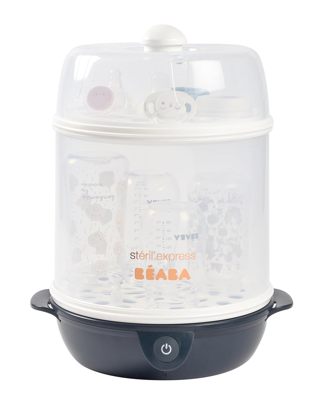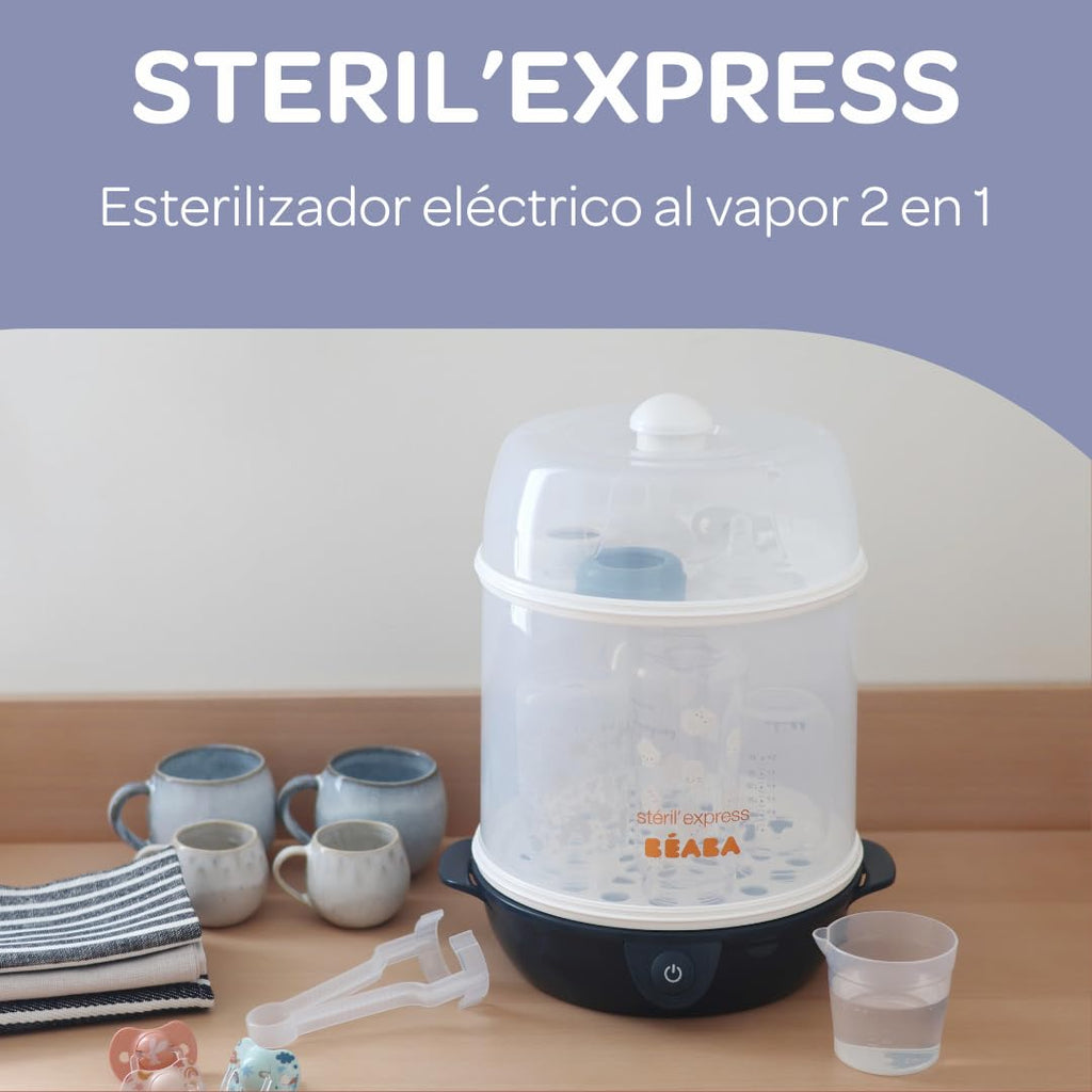 2 in 1 elektrischer Dampfsterilisator. Elektrischer Dampfsterilisator mit zwei Fächern. Das erste, große Fach für Flaschen und großes Zubehör (z.B. Geschirr), kann bis zu 8 Enghalsflaschen und 6 Weithalsflaschen aufnehmen. Das kleine Fach fasst Zubehör wie Schnuller, Sauger, Ringe, Besteck oder Medikamentenpipetten. Das kleine Fach kann auch allein verwendet werden. Technische Daten Fassungsvermögen des Behälters: 150 ml Abmessungen des Produkts: H36 x 28,5 x 25 cm Gewicht des Produkts: 1.670 g Hauptmaterial : Grill, Glocken, Boden, Messbecher, Zange: Polypropylen Knopf: Silikon