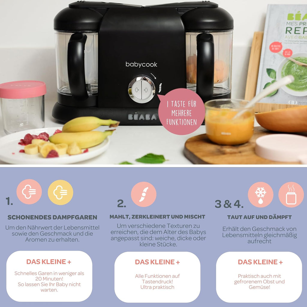 Produktbeschreibung Dampfgaren, Mixen, Auftauen, Aufwärmen. XXL-Kapazität. Schnelles Dampfgaren in 15 Minuten: bewahrt den Geschmack und die Vitamine. XXL-Fassungsvermögen (2.200 ml): für die Zubereitung großer Mengen im Handumdrehen. 2 separate Glaskrüge: Dadurch können gleichzeitig 2 Mahlzeiten gekocht und jeweils der Geruch und Geschmack jedes Gerichts bewahrt werden. Mixen nach Maß, für eine Konsistenz, die dem Alter des Kindes entspricht. Einzelner Bedienschalter (Dampfgaren, Mixen): ultrakompakte Lösung. Zubehör: Mixeinsatz / Smoothie-Filter, Spatel und Rezeptbüchlein im Lieferumfang inbegriffen. Pflege: Abdeckung, Korb, Mixerdeckel, Mixerklinge: Spülen per Hand oder Geschirrspülmaschine. Gerätegehäuse: Reinigen Sie das Gehäuse mit einem feuchten weichen Tuch. Nicht im Wasser eintauchen. Set enthält: Babycook Duo