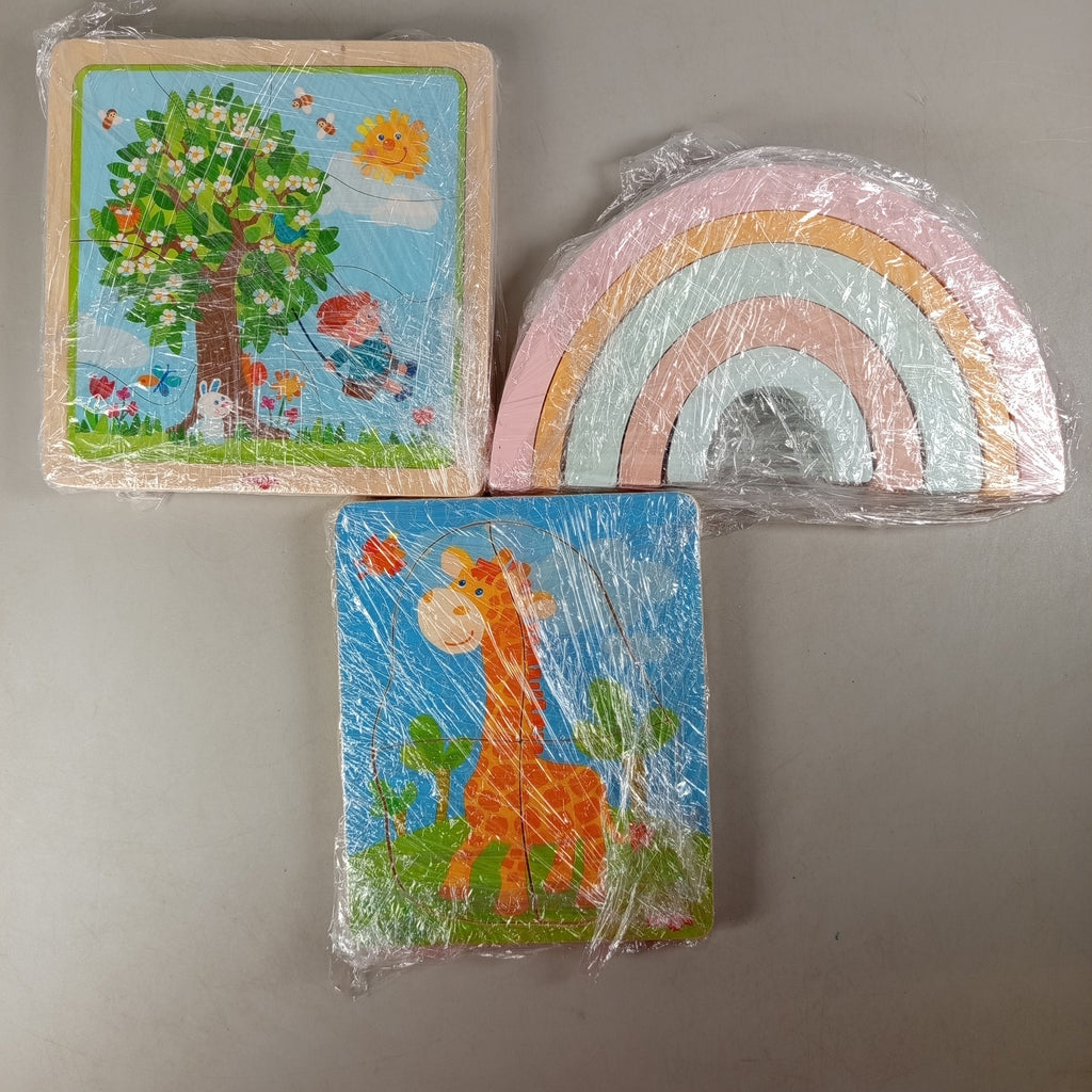 Hol dir das Holzspielzeug-Set von Habermaass mit zwei liebevoll gestalteten Holzpuzzles und einem farbenfrohen Regenbogenstapler aus sechs Bögen. Ideal zum Lernen, Stapeln und Spielen. Die Spielzeuge sind gebraucht, in gutem Zustand, ohne Originalverpackung. Gib diesem nachhaltigen Spielzeug ein zweites Leben und fördere spielerisch die motorischen Fähigkeiten. Die Vollständigkeit konnte nicht überprüft werden.