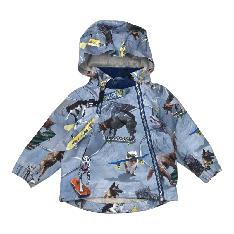 Molo's lightweight version of hopla jacket. Detachable hood, a slanted zip closure, an adjustable bottom and Molo's star reflector at the side of both sleeves and on the back. Fabric is originally waterproof and breathable and has taped seams.