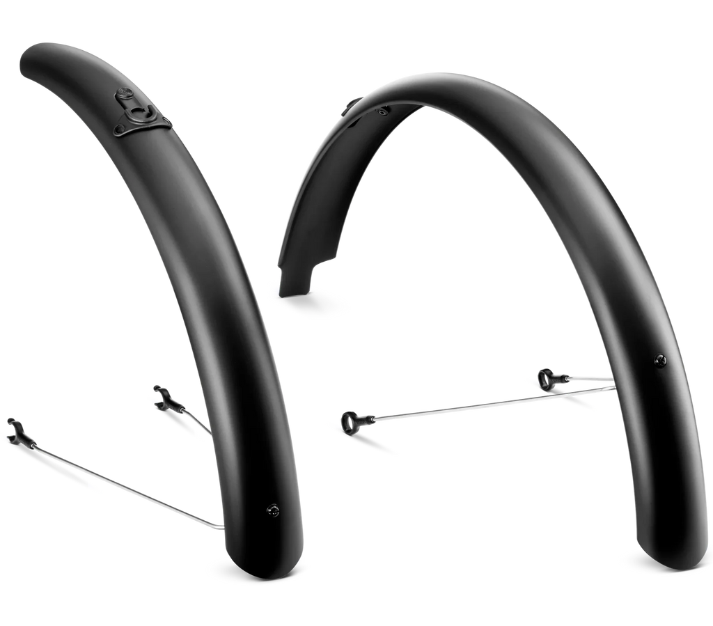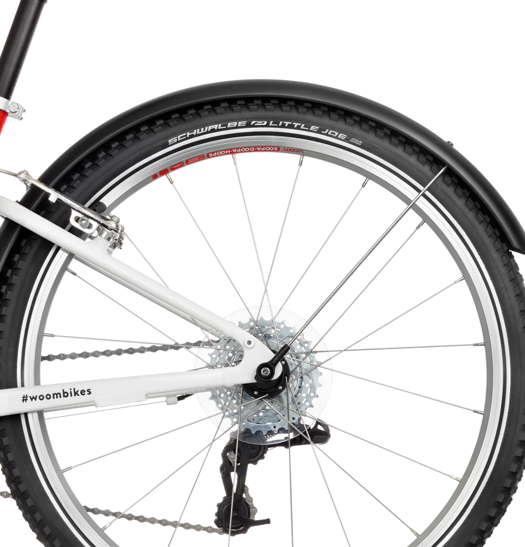 Die Schutzblech-Sets für die woom GO / ORIGINAL Fahrräder von 14 bis 26 Zoll lassen sich einfach an Vorder- und Hinterrad an- und abstecken und schützen optimal vor Spritzwasser.
