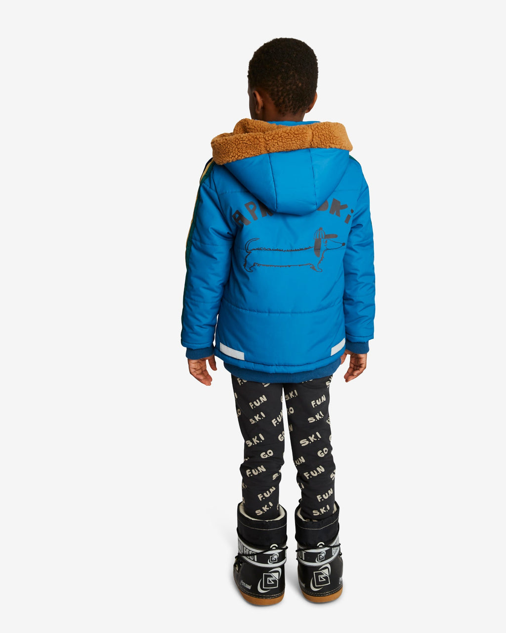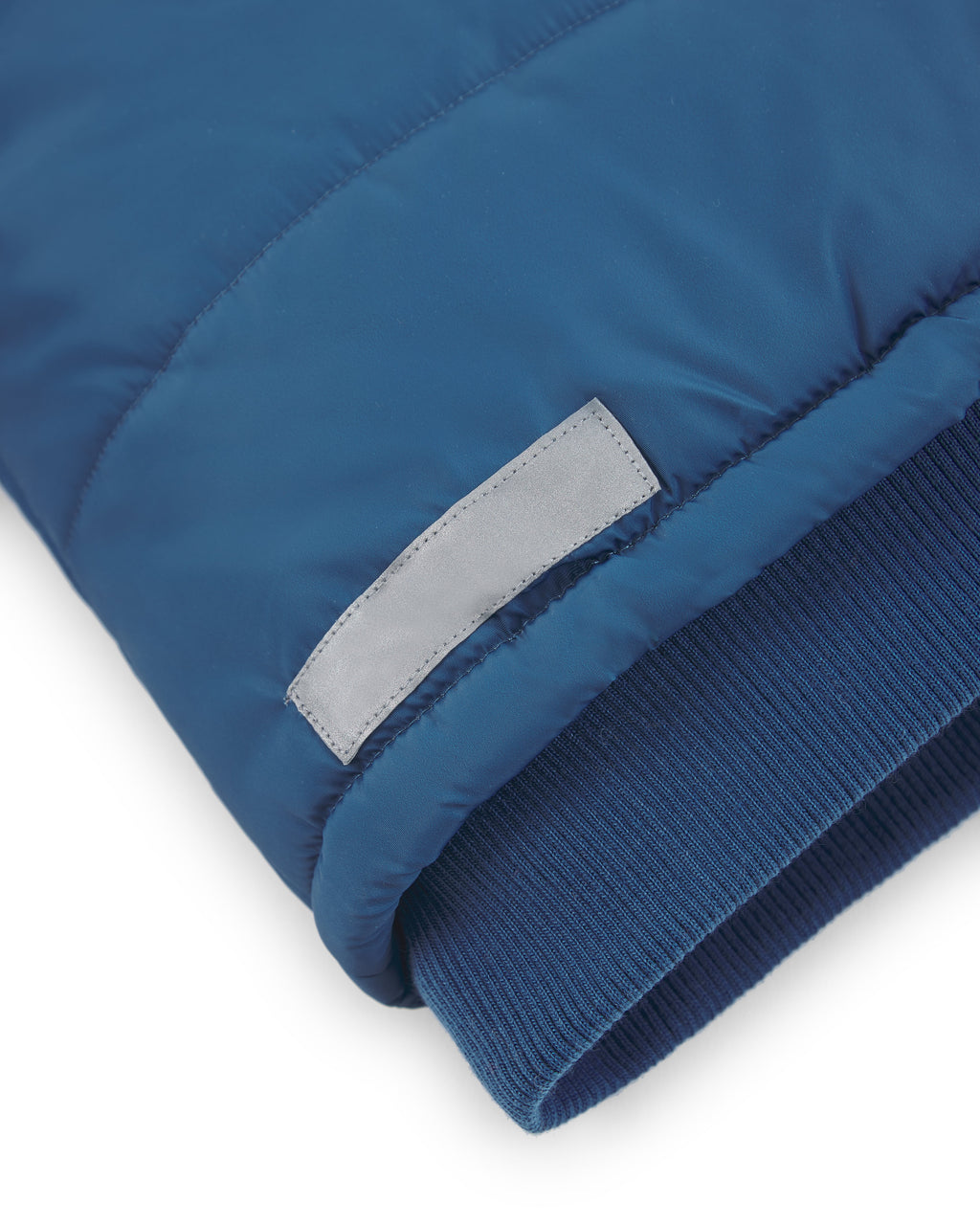 Abrigo de niño acolchado en color azul eléctrico con largo cadera y cierre de cremallera. Está forrado completamente con un calentito forro polar color verde. Lleva además un práctico cinturón en su interior para llevarlo atado en la cintura (así los papás no lo tienen que cargarlo ;))