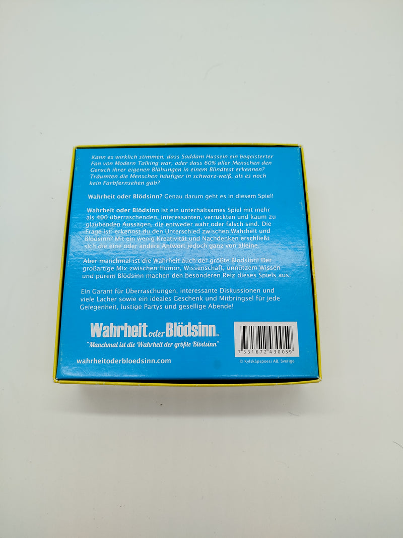Wahrheit oder Blödsinn ist das perfekte Spiel für Quizliebhaber und alle, die gerne mit verrückten Fakten und absurden Behauptungen überrascht werden! Das Spiel enthält über 400 skurrile, verblüffende oder völlig ausgedachte Aussagen – doch welche sind wahr und welche kompletter Blödsinn? Die Spieler müssen raten, ob die Behauptung korrekt ist oder nicht. Ein unterhaltsames und lehrreiches Spiel für Partys, Familienabende oder gesellige Runden mit Freunden. Wer durchschaut die größten Lügen und kennt die unglaublichsten Wahrheiten? Findet es heraus!