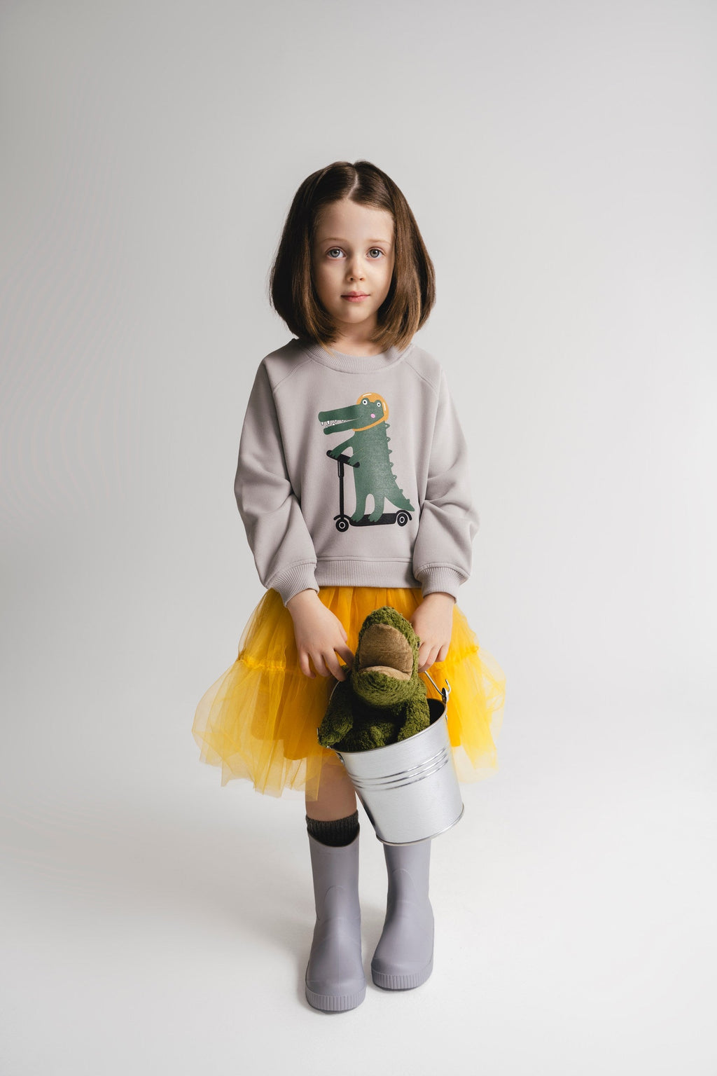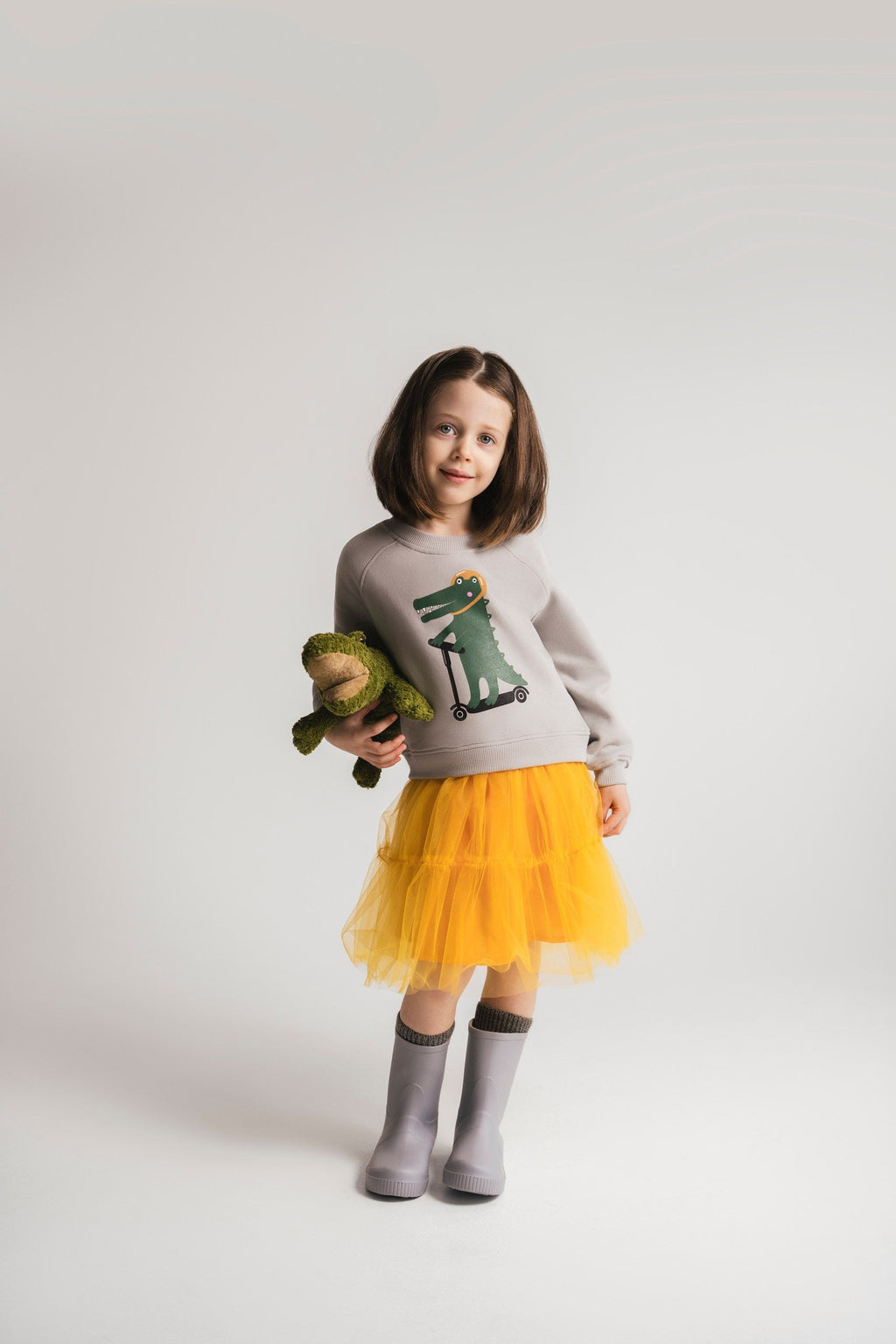 Abenteuer trifft Stil! Dieses Kleid begeistert kleine Entdeckerinnen mit einem frechen Krokodil-Motiv auf weichem Baumwollstoff und einem Tüllrock, der bei jedem Sprung perfekt mitschwingt. Egal ob im Dschungel des Gartens oder auf der Schaukel – hier wird jedes Abenteuer modisch gemeistert.
