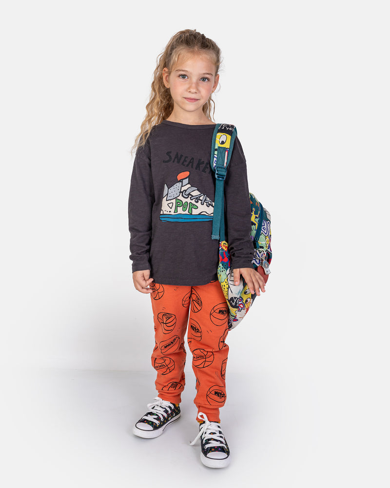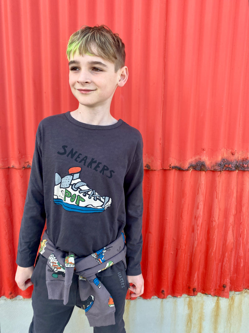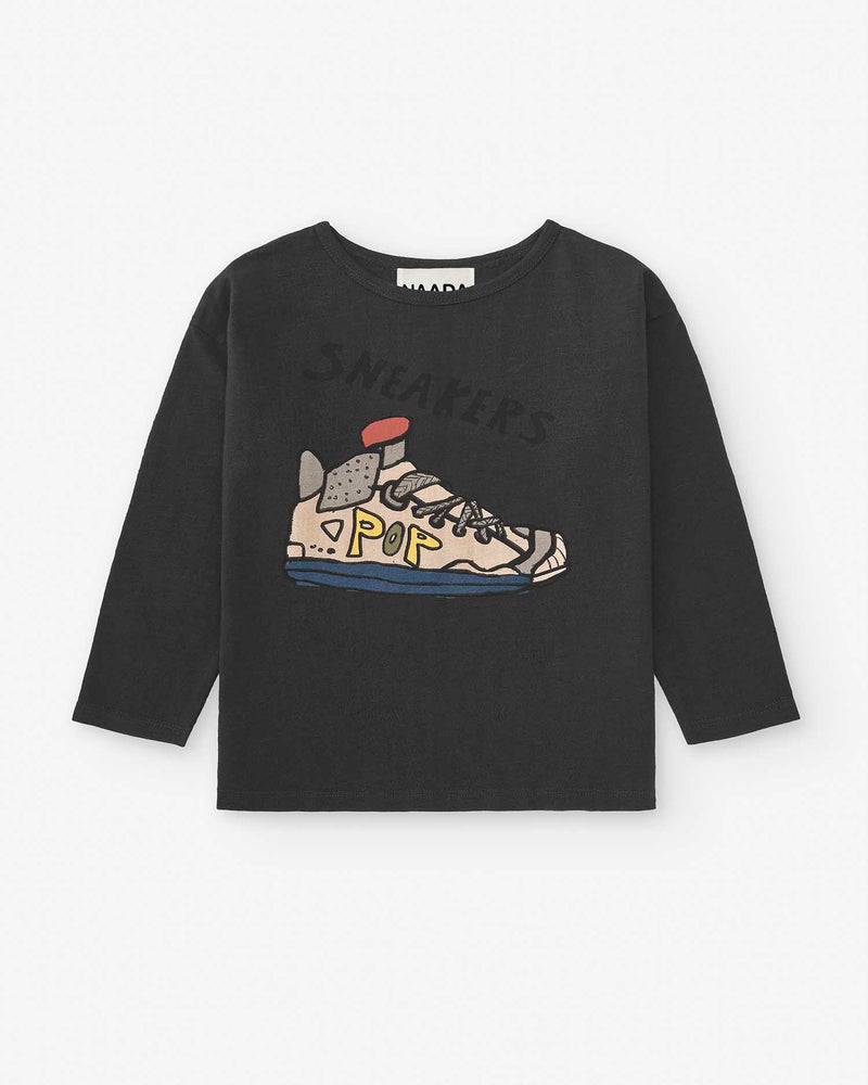 Camiseta de manga larga de algodón orgánico para niños con estampado Sneakers. La ciudad es muy grande y hay que andar mucho..mejor que te pongas unas zapatillas cómodas ;) La camiseta tiene un patron amplio con hombro caído.