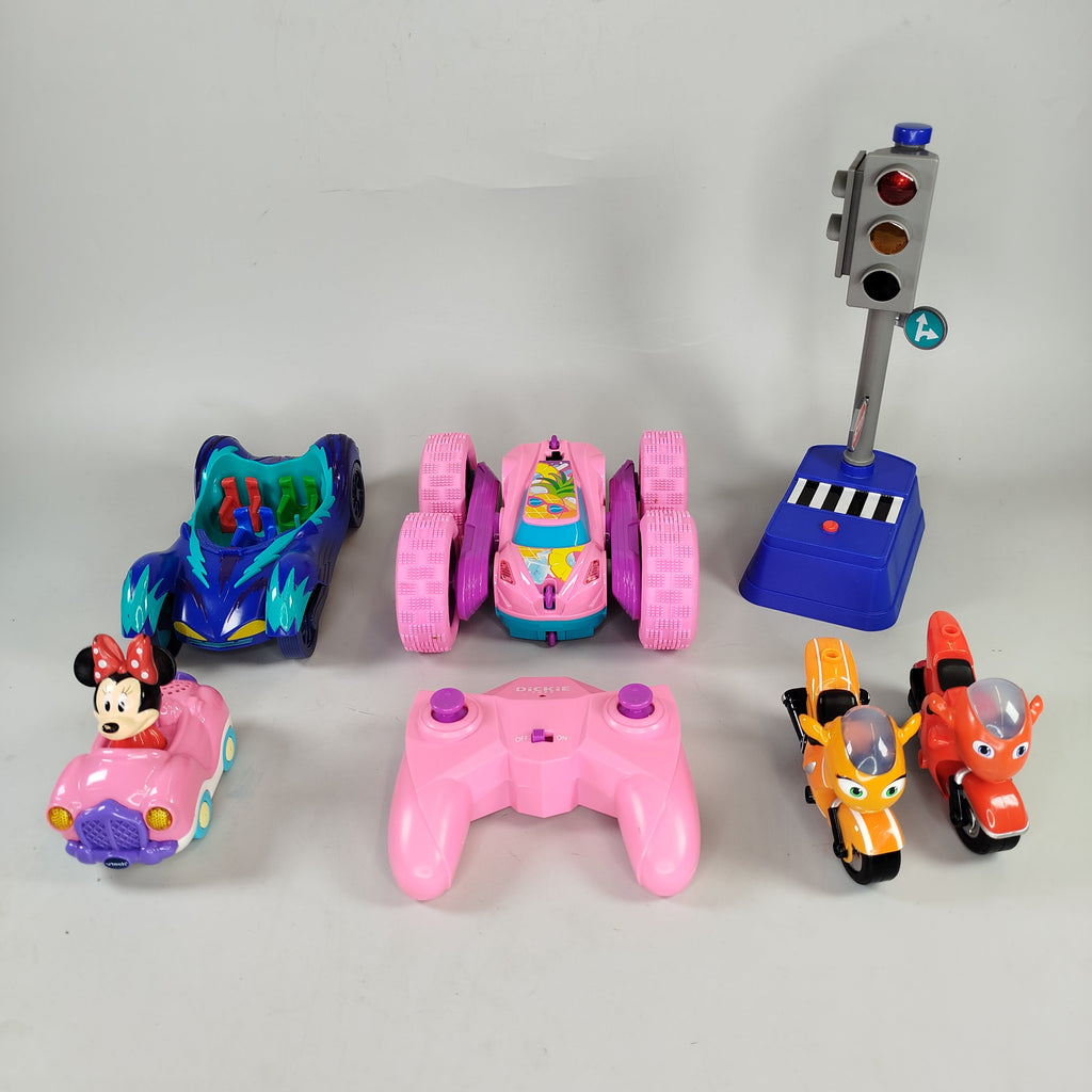 Dieses Set aus verschiedenen elektronischen Fahrzeugen bietet großen Spielspaß für kleine Rennfahrer. Enthalten sind ein ferngesteuertes Stunt-Auto von Dickie Toys, ein Minnie Mouse Auto, zwei Motorräder, ein weiteres Fahrzeug sowie eine Verkehrsampel mit Sound. Die Fahrzeuge sind teilweise batteriebetrieben (Batterien nicht enthalten). Sicherheitshinweis: Nicht für Kinder unter 3 Jahren geeignet, da Kleinteile verschluckt werden können.