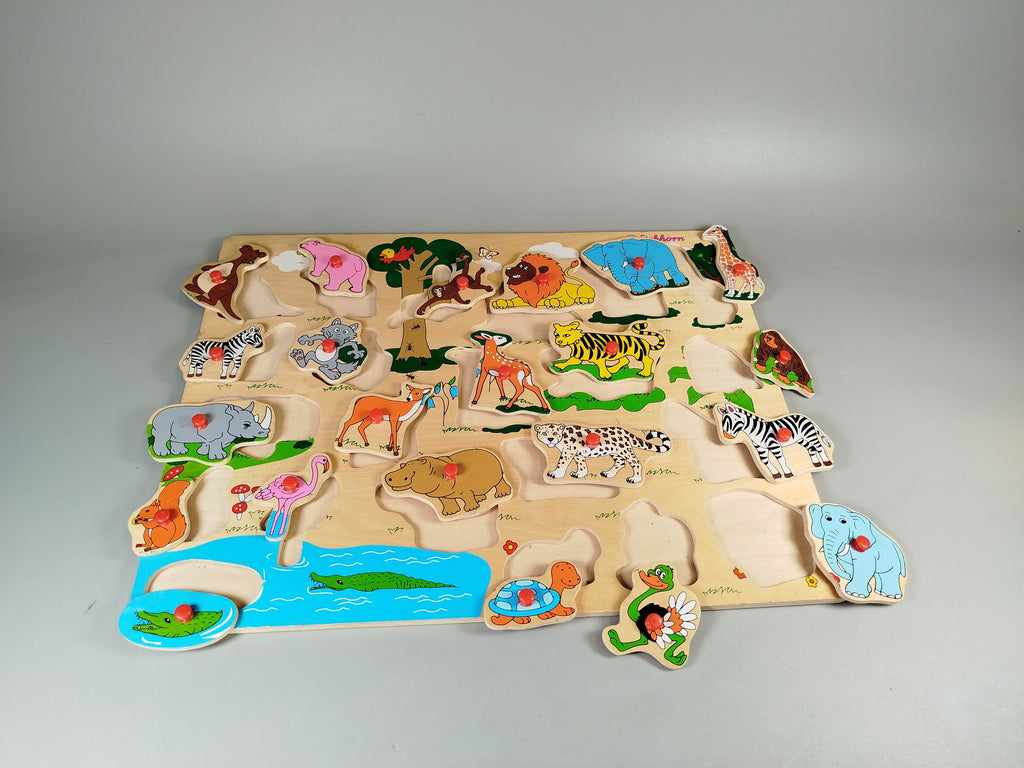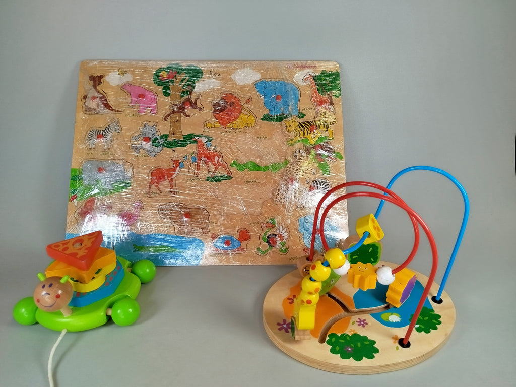Hol dir das Eichhorn Holzspielzeug-Set und fördere die motorischen Fähigkeiten deines Kindes! Dieses Set besteht aus einem Drahtlabyrinth mit Tierfiguren und einem Nachzieh-Schildkröte mit stapelbaren Formen. Beide Spielzeuge sind darauf ausgelegt, die Hand-Augen-Koordination und Formenerkennung bei Kindern zu fördern. Trotz kleiner Gebrauchsspuren ist das Set vollständig und bereit für neue Abenteuer. Gib diesen wunderschönen Spielzeugen ein neues Zuhause und freue dich auf leuchtende Kinderaugen! Das Spielzeug befindet sich in einem guten Zustand. Hinweis: Das Set enthält keine Originalverpackung oder Anleitung.